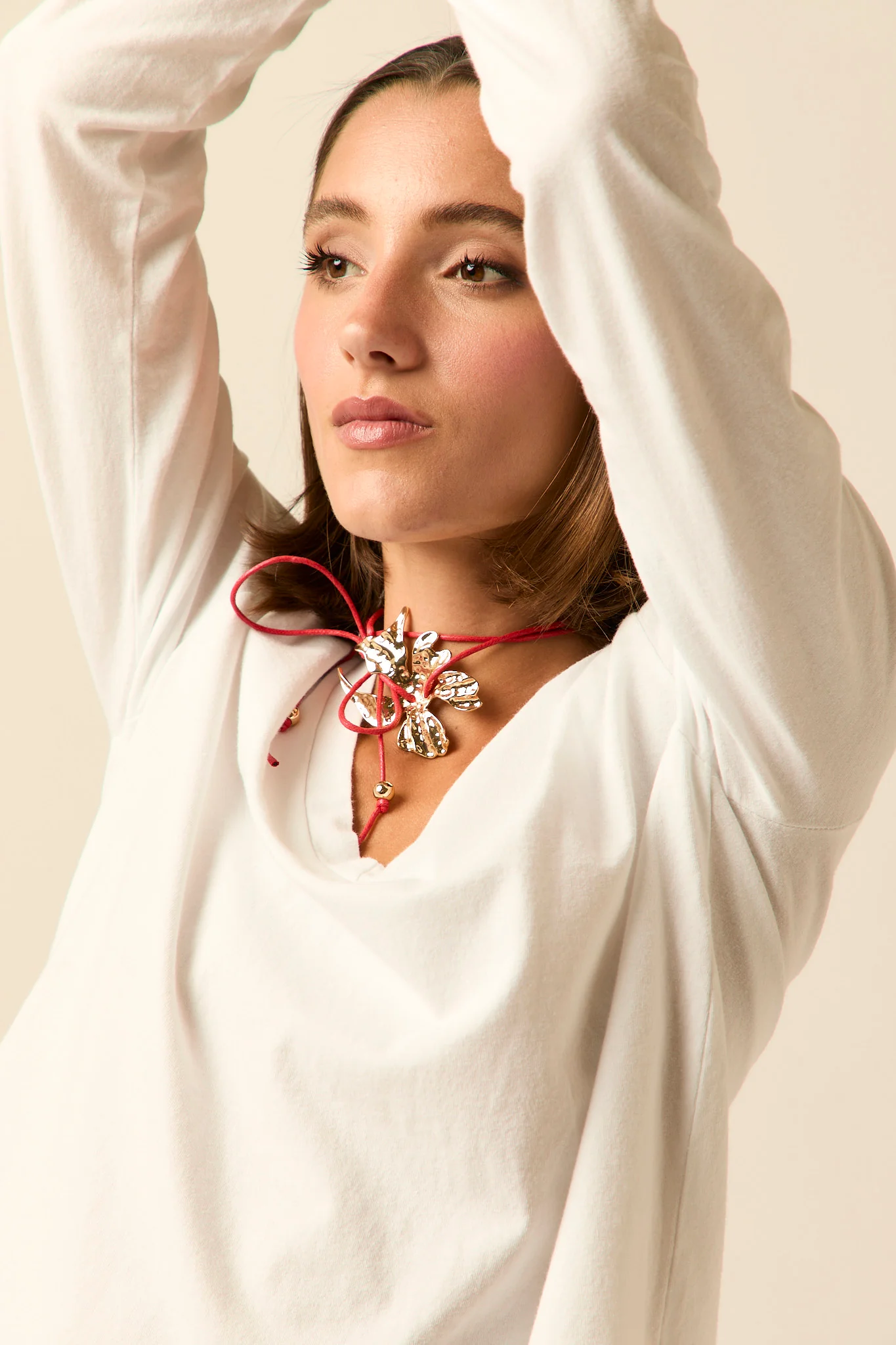 Colgante de cuerda de terciopelo en color rojo con flor dorada.