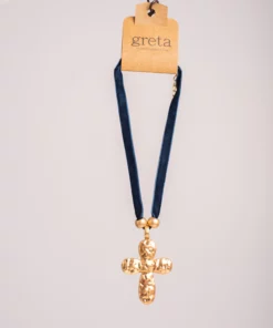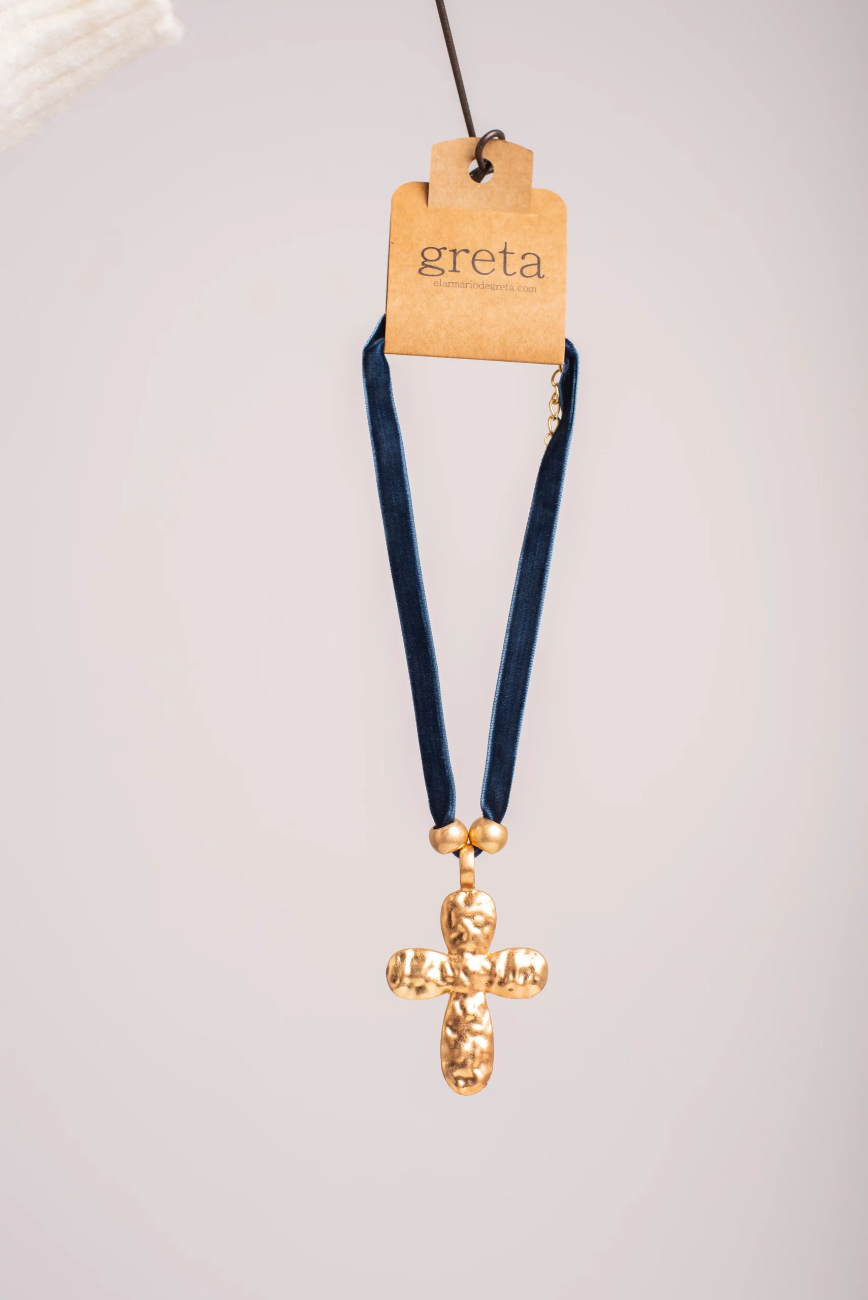 Collar corto, cinta de terciopelo. Colgante de cruz dorada.