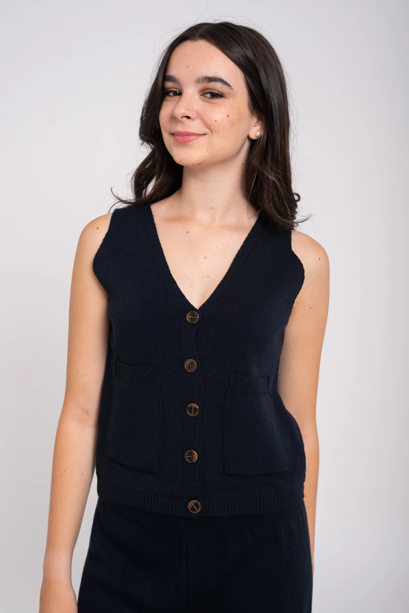 Conjunto de chaleco y pantalón. Chaleco abotonado sobre el pecho y pantalón con goma en cintura. Total look de punto ideal para llevar solo o combinado con una camiseta o camisa. ¡Te va a enamorar!