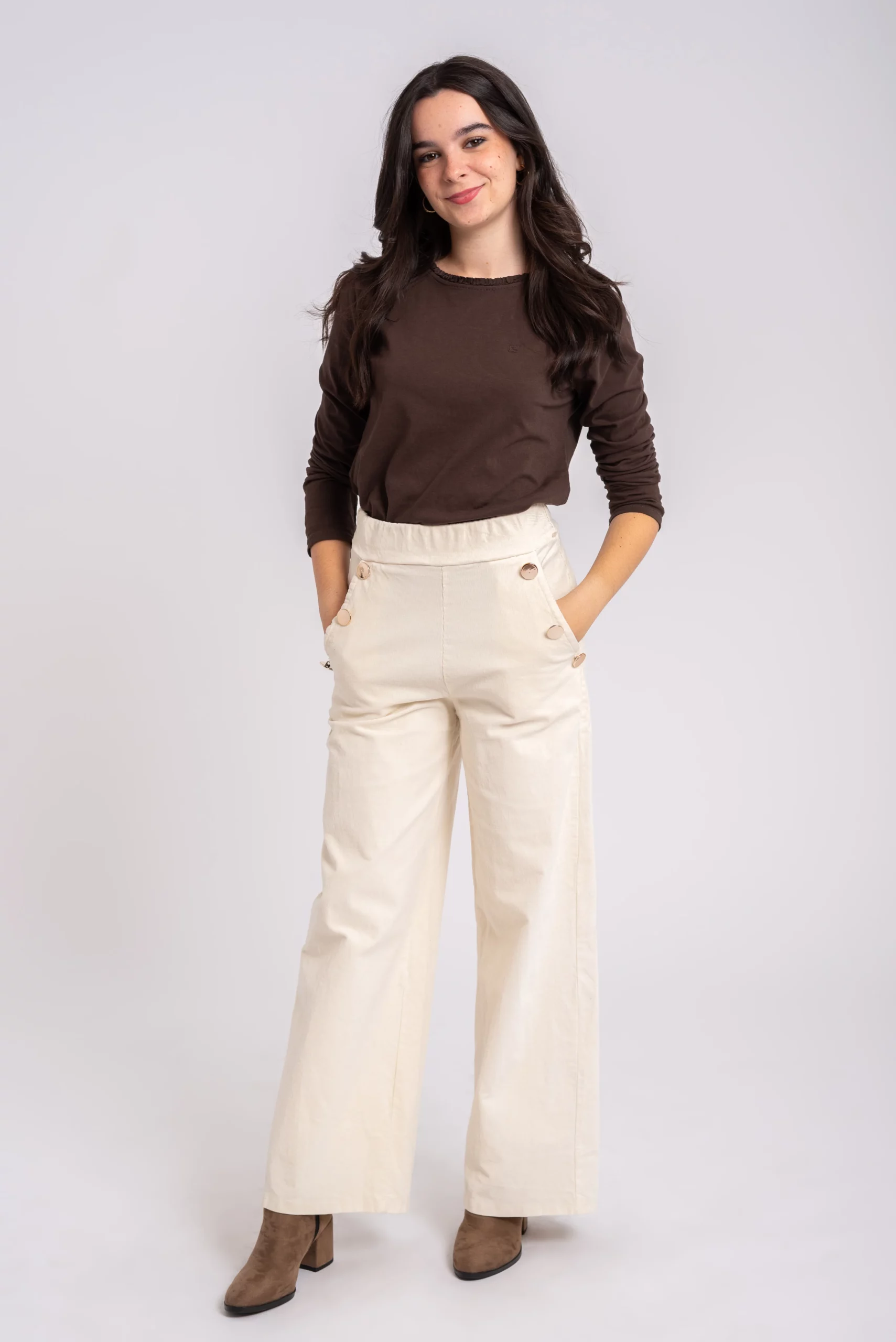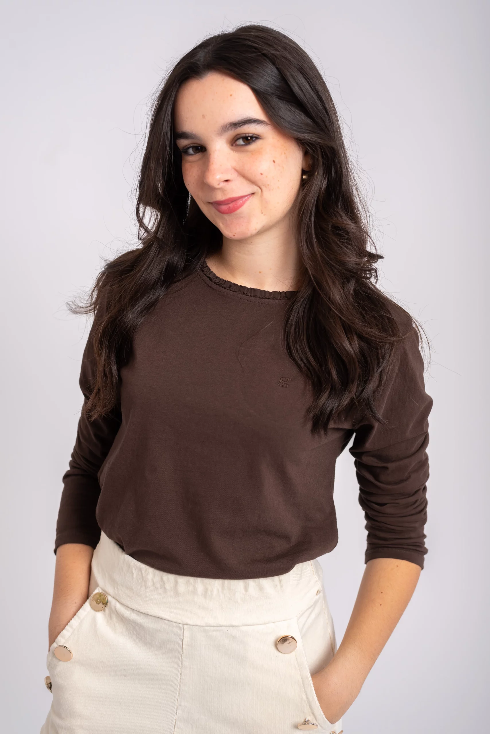 Camiseta básica con nuestro logo bordado al tono. Cuello redondo con detalle de volante tableado. Manga larga. Un fondo de armario imprescindible. Ideal en todos lo colores.