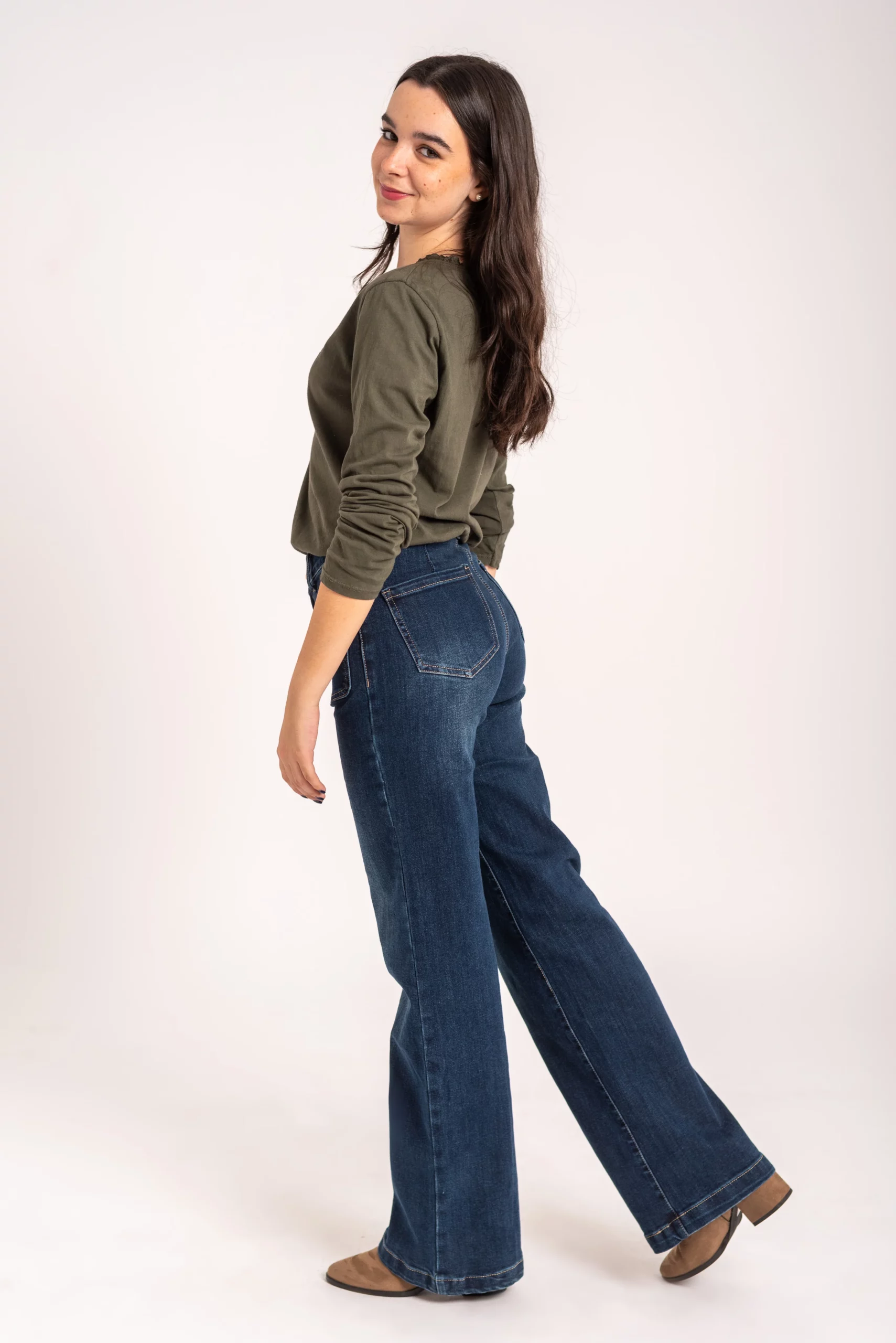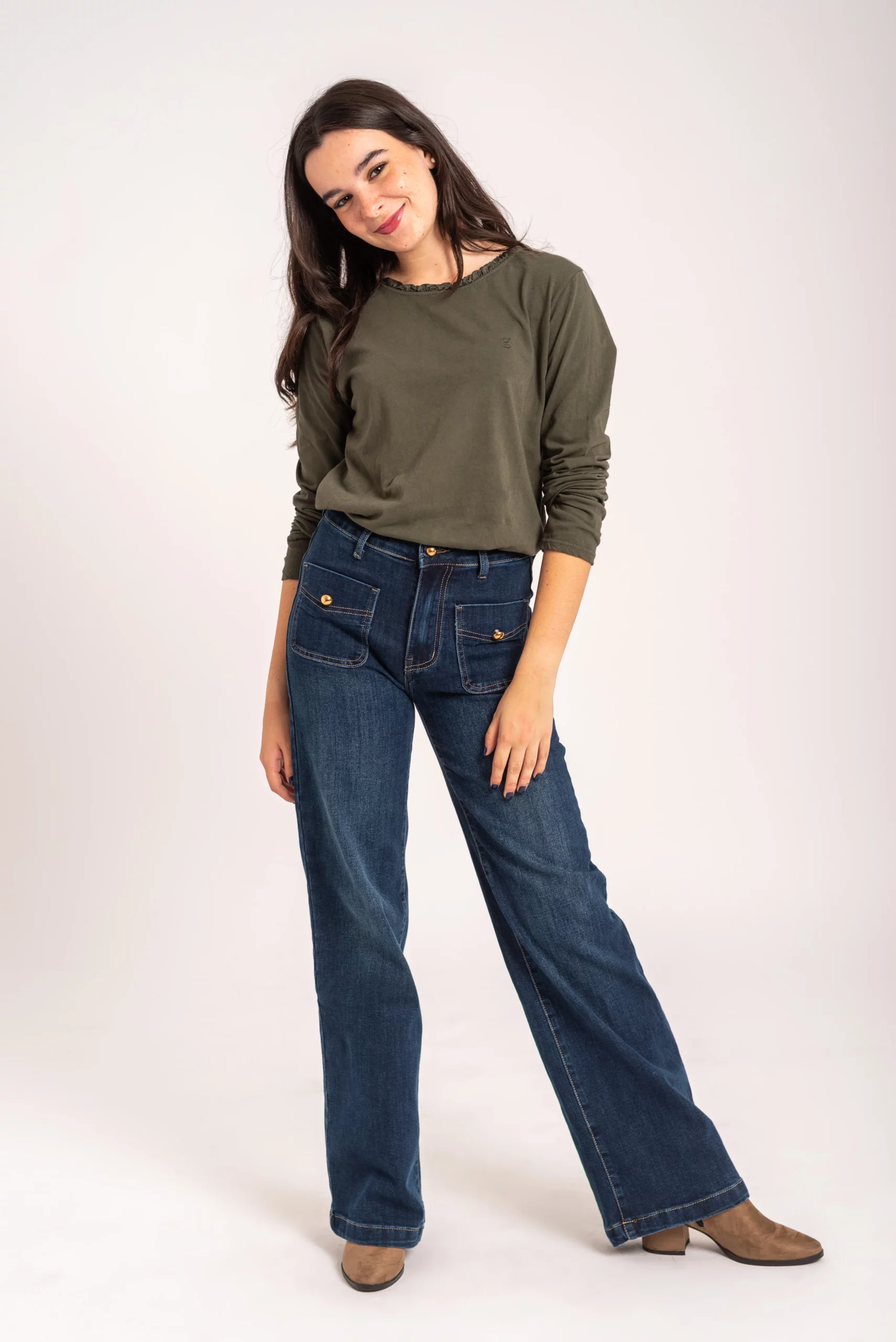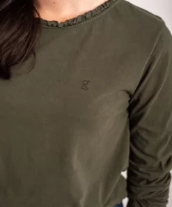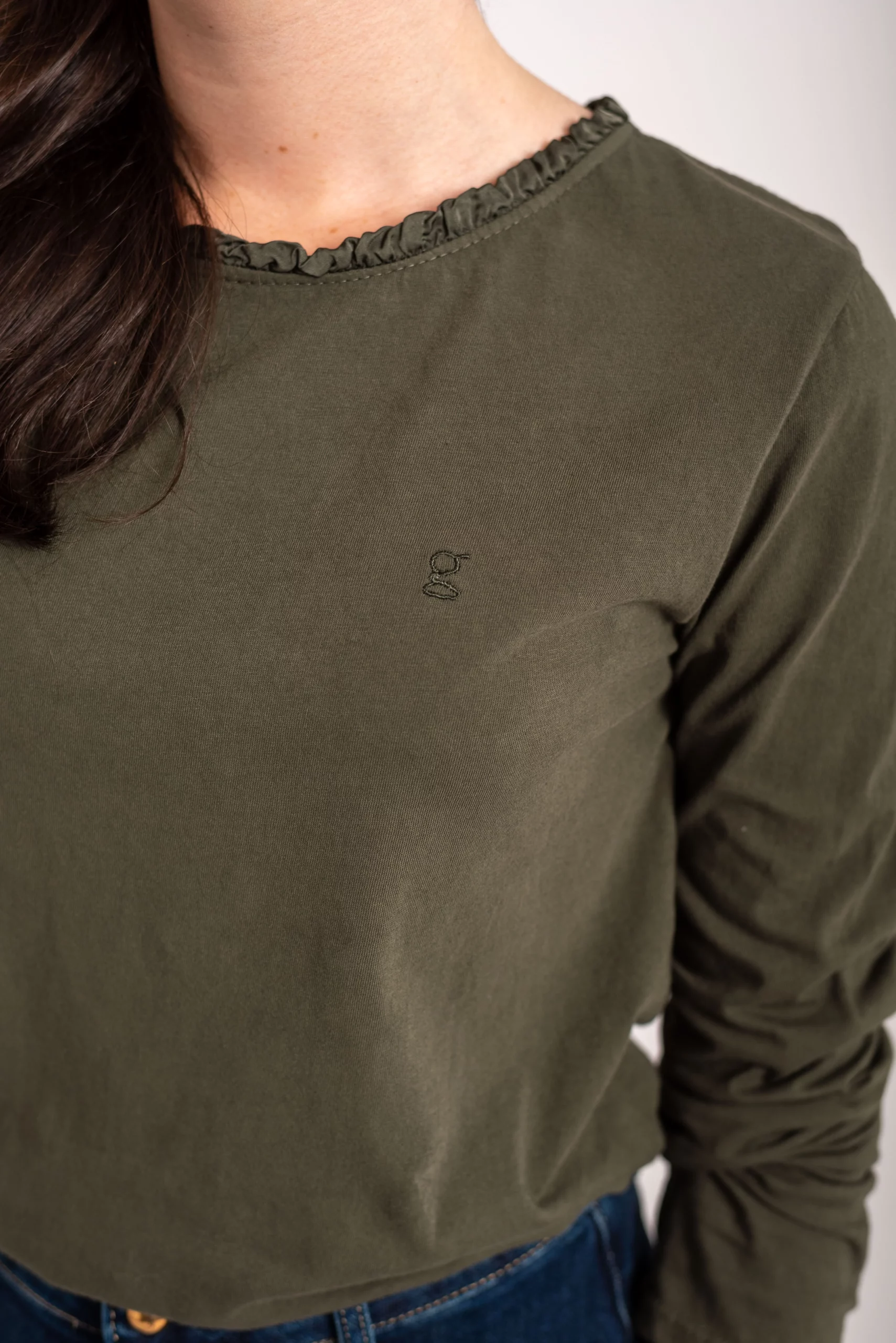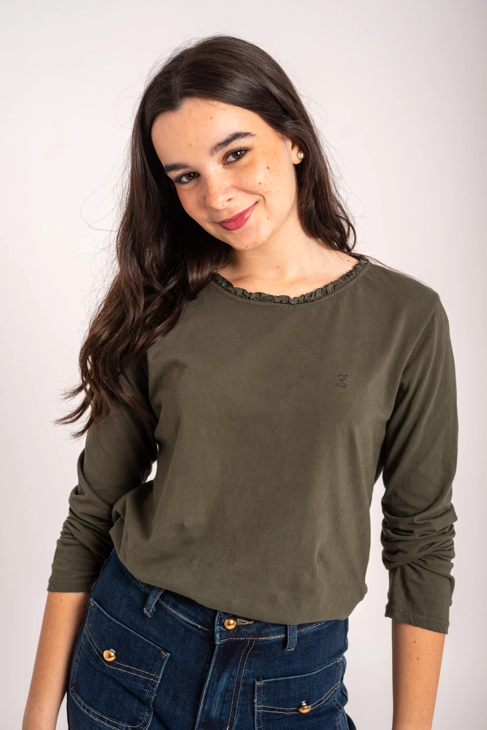 Camiseta básica con nuestro logo bordado al tono. Cuello redondo con detalle de volante tableado. Manga larga. Un fondo de armario imprescindible. Ideal en todos lo colores.