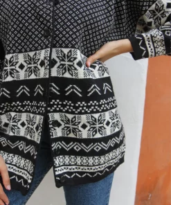 Long cardigan in black and white fair isle print.