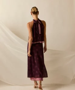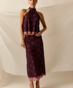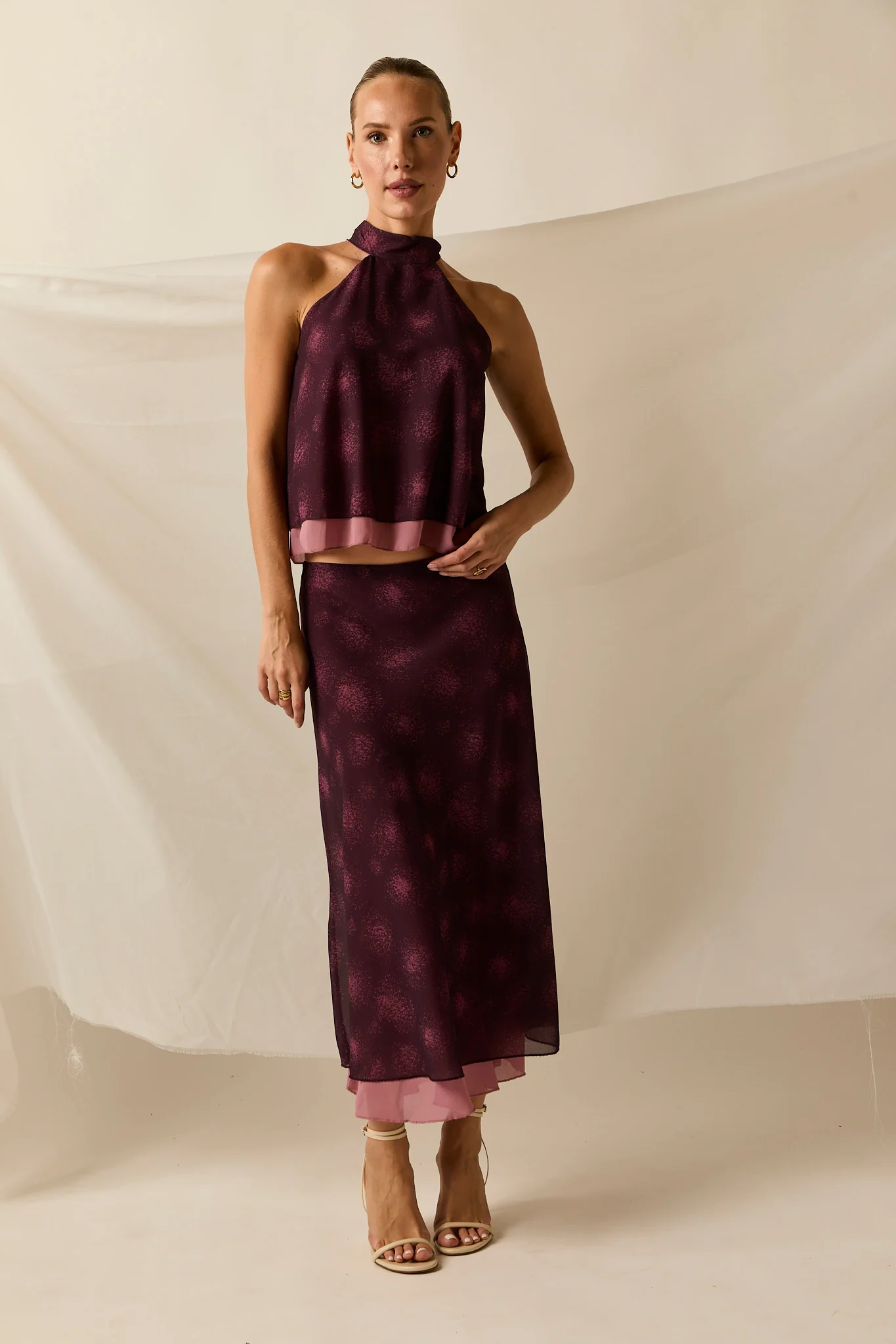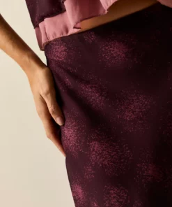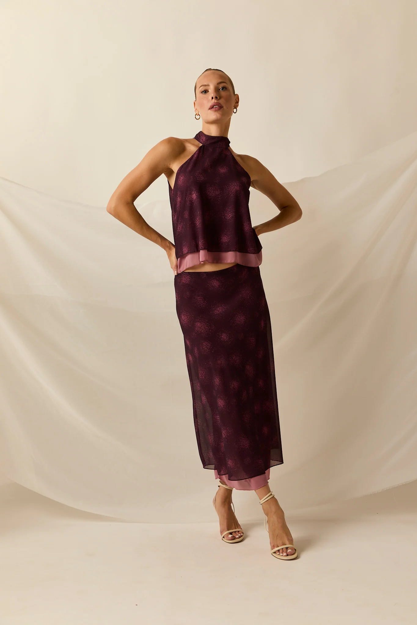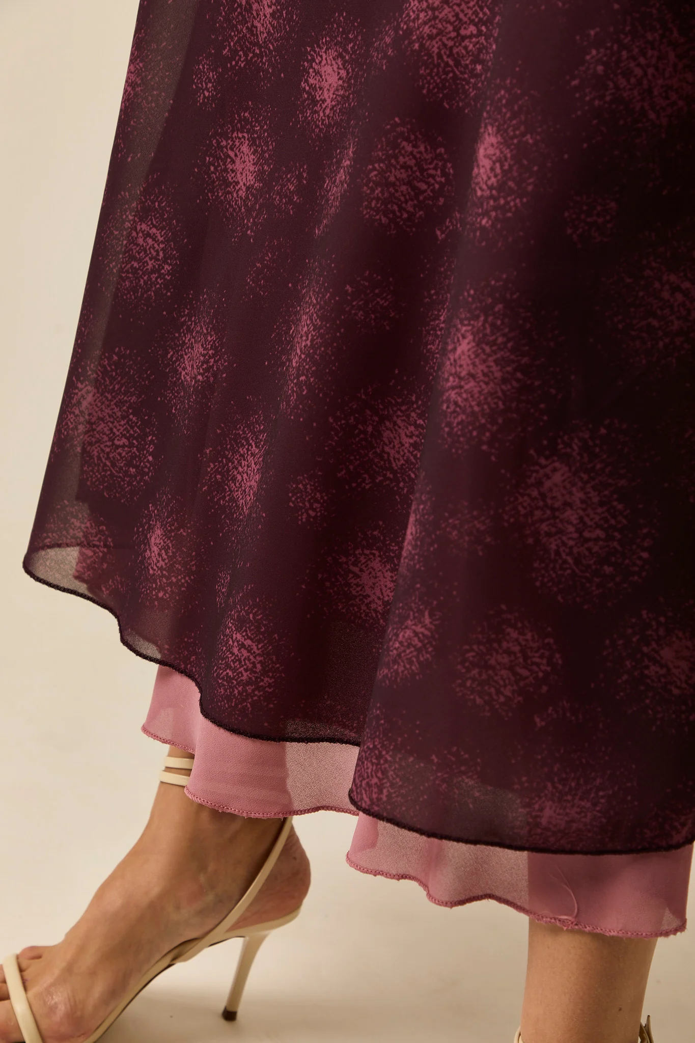 Falda midi de gasa con doble tejido combinado y print en tonos berenjena y rosa. Tiro medio, cintura elástica y diseño recto.