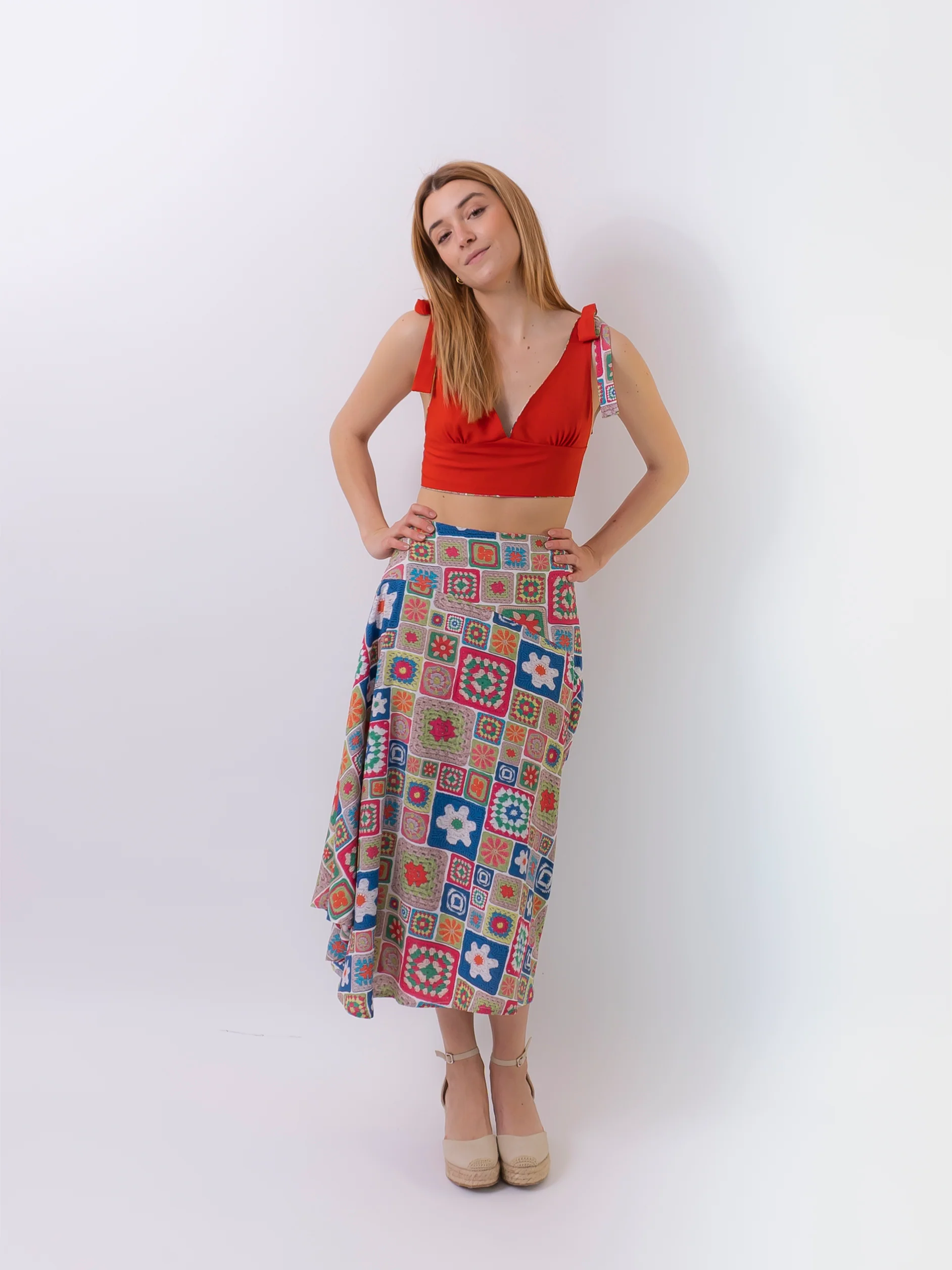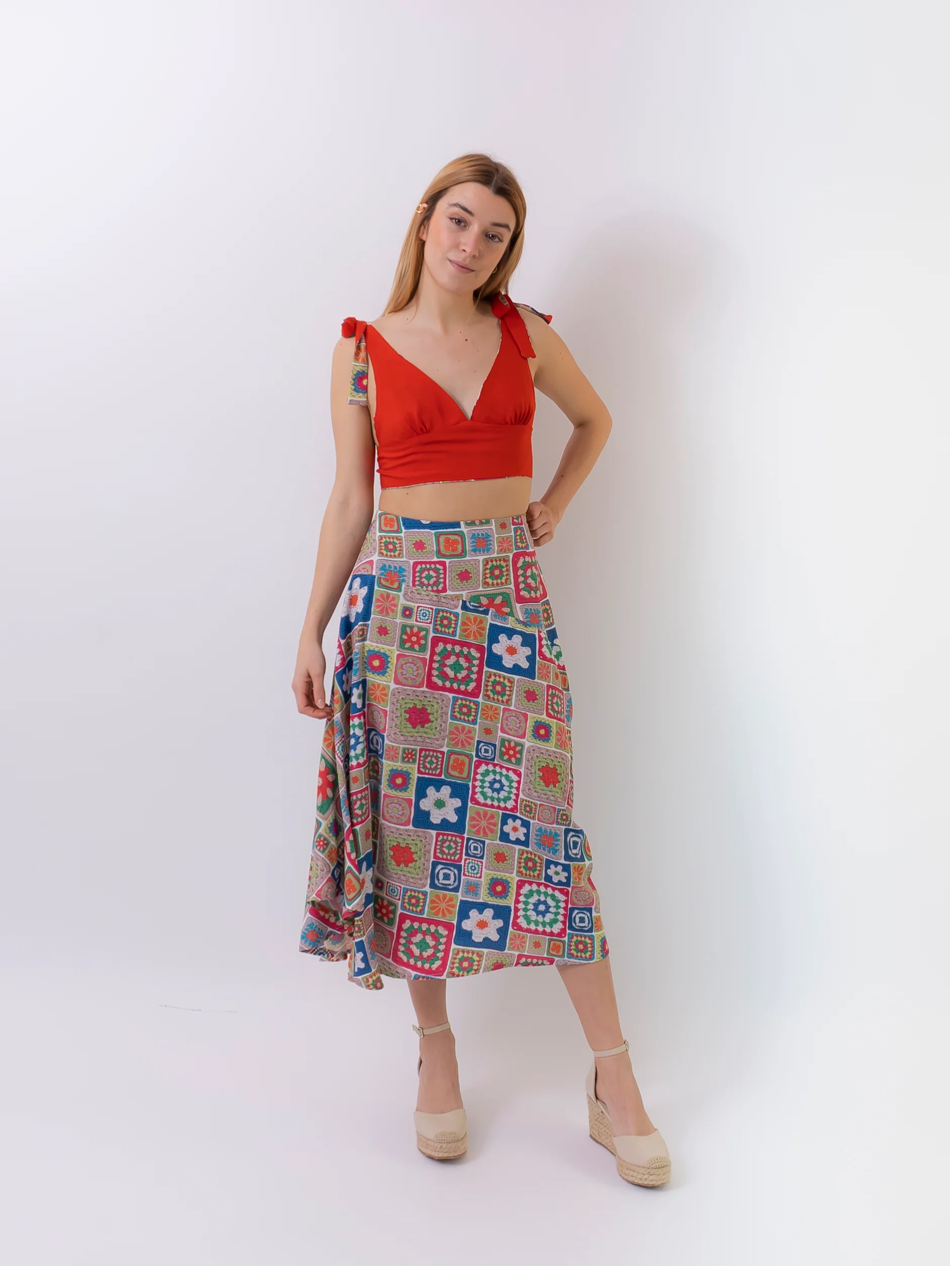 ¿Tienes que ir a trabajar esta temporada? Esta será la falda más fresquita que podrás encontrar (también sospechamos que para viajes y tomar algo es una fantasía). Estampado de colores brillantes. Falda con vista, no va forrada por dentro (no es necesario el forro, el tejido no transparenta y así es más ligera y tiene más vuelo).