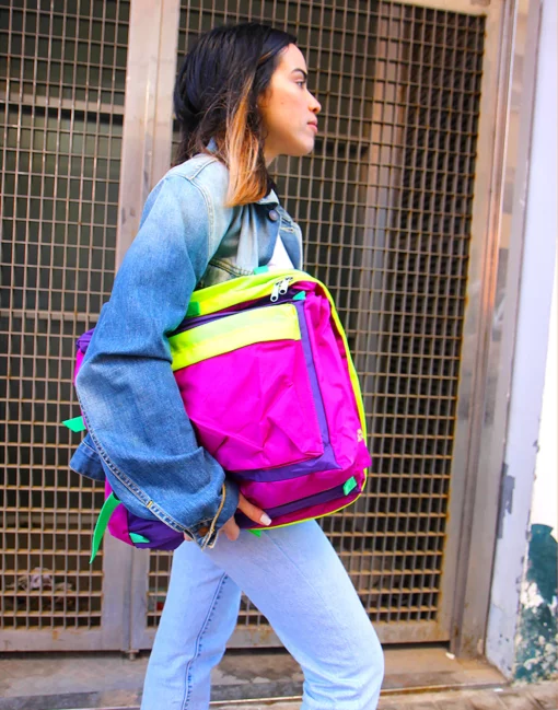 Vintage garment bag in a bright pink, purple and neon yellow.