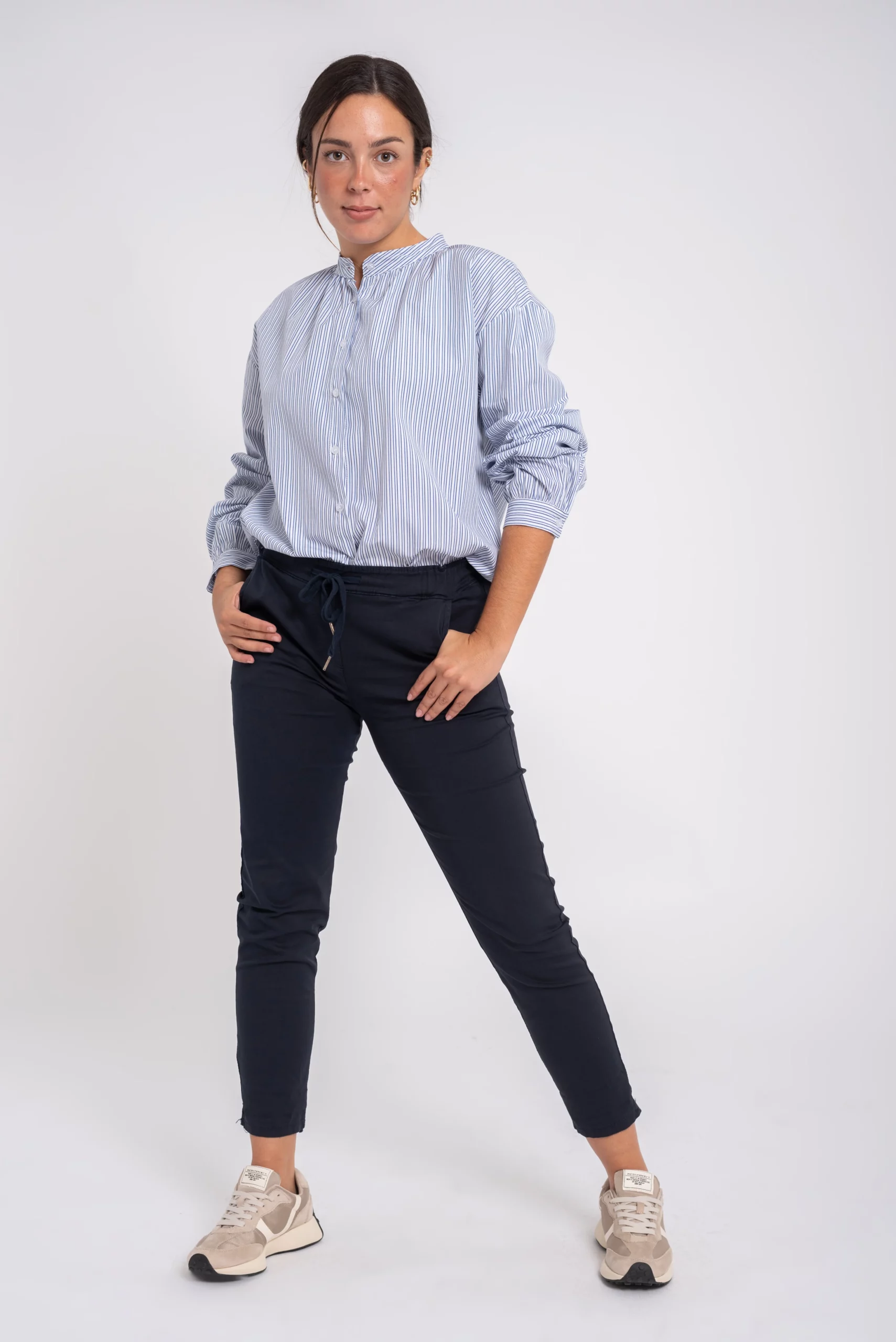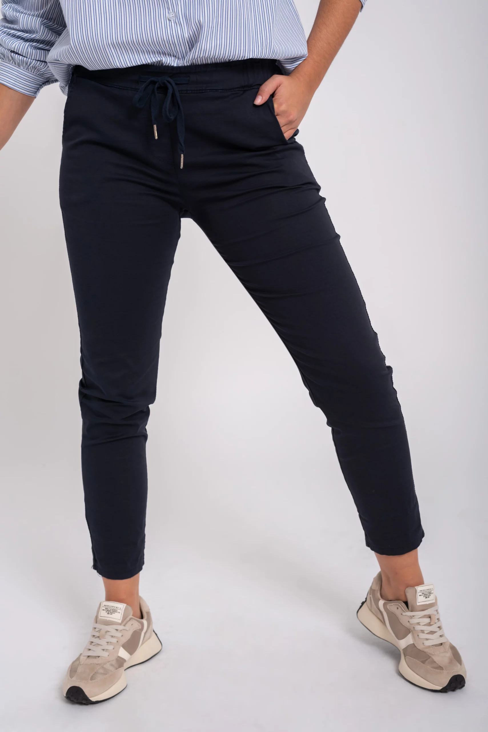 Pantalón tipo chino, con goma en cintura y cordón de ajuste. Bolsillos laterales. Cómodo y perfecto para toda la temporada. Básicos imprescindibles.