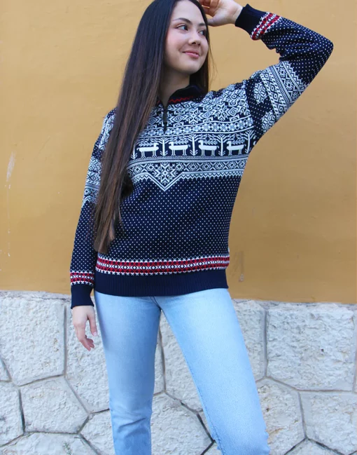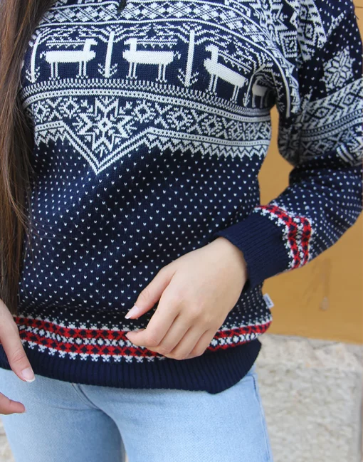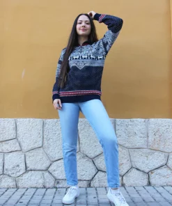 Vintage jumper in navy blue and white fair isle print.