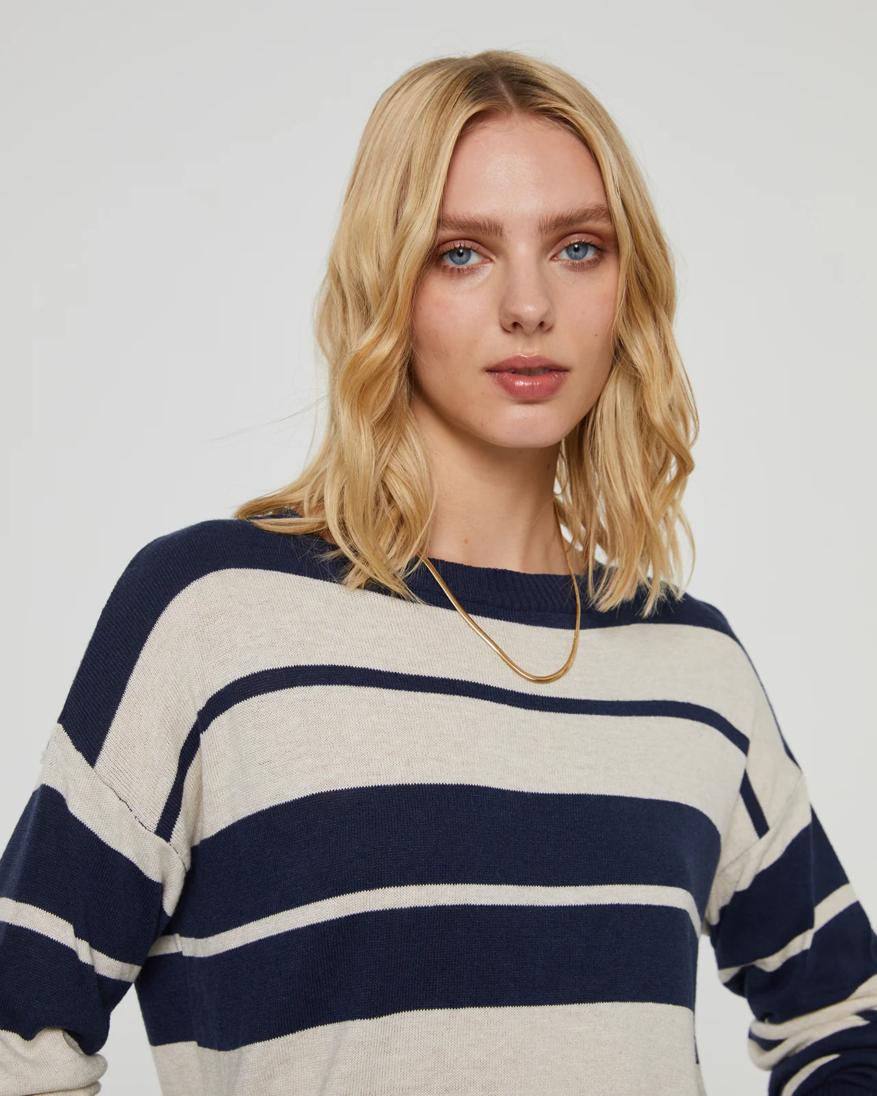 Jersey de rayas bicolor manga larga y escote redondo. Un jersey básico con un estilo marinero que nunca pasa de moda.
