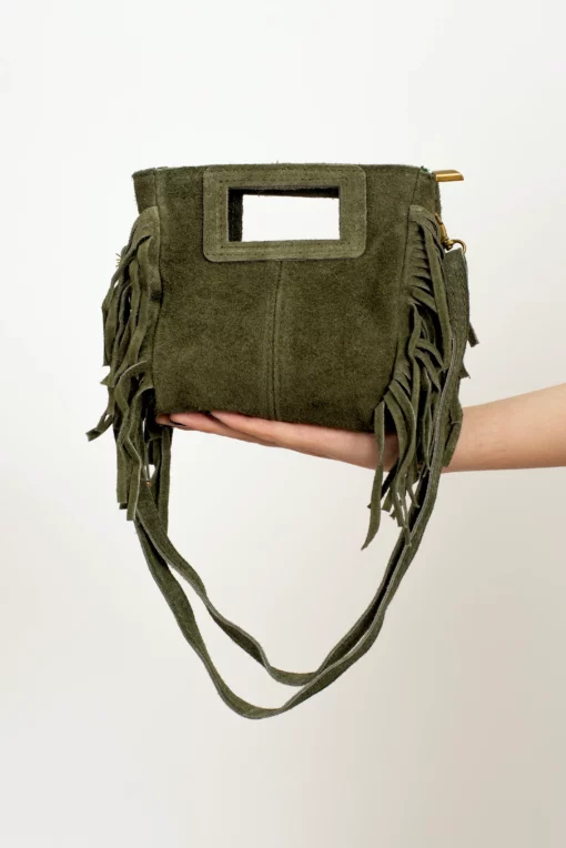 Bolso de piel, serraje. Tamaño mini del bolso Kiowa. Asa corta integrada en el bolso para llevar de mano y larga para bandolera. Flecos en ambos laterales. Cierre con cremallera.