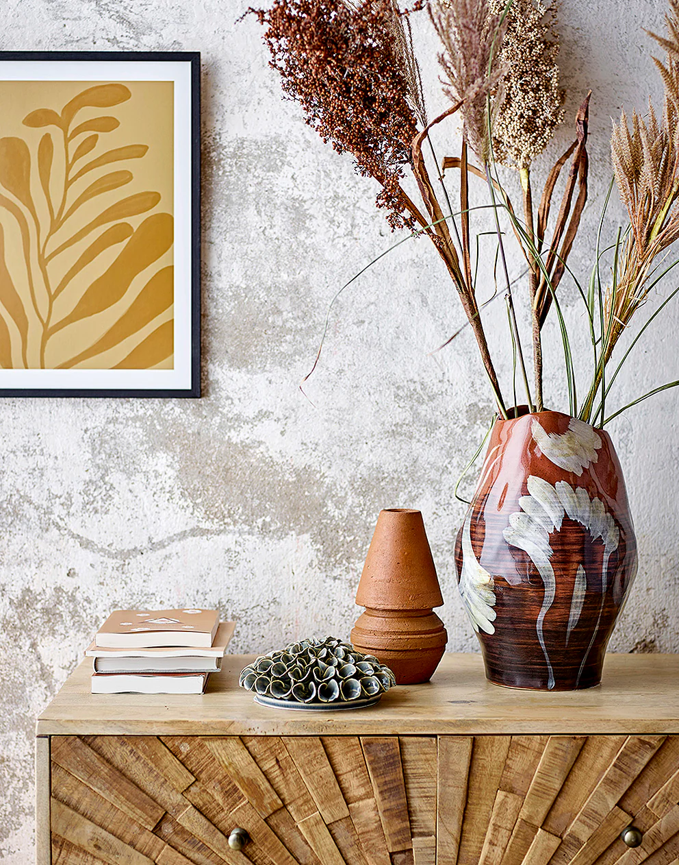 Natural stoneware vase in terracotta with hand painted floral design in white and black.
