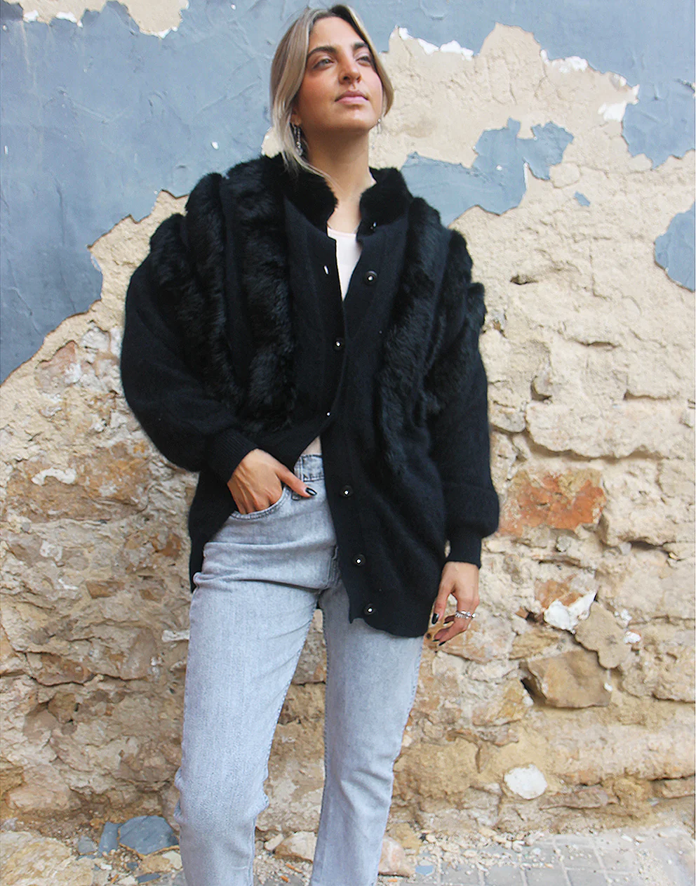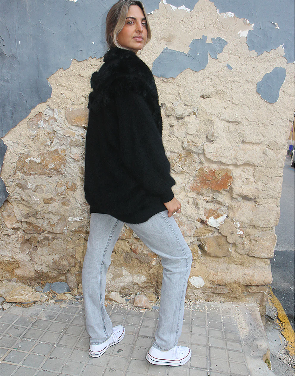 Measurements: 50″/ 127cm bust – 23″/ 58cm sleeve length – 32″ / 81cm top length.