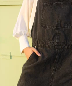 Measurements – 11″(28cm) top of bib – 16.5″(42cm) bottom of bib – 34″(87cm) waist – 42″(107cm) hips – 28″(71cm) inner leg – 13″(34cm) rise.