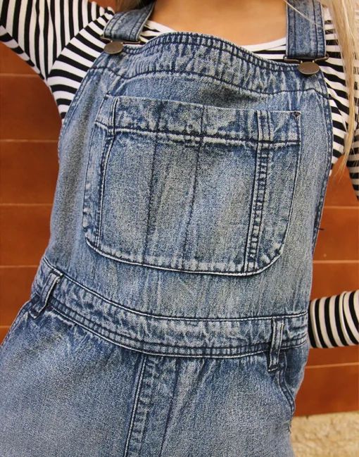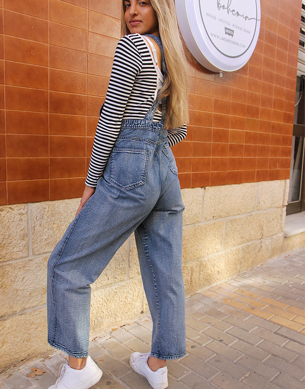 Measurements – 11″(28cm) top of bib – 17″(43cm) bottom of bib – 36″(92cm) waist – 44″(112cm) hips – 29.5″(75cm) inner leg – 14″(36cm) rise.