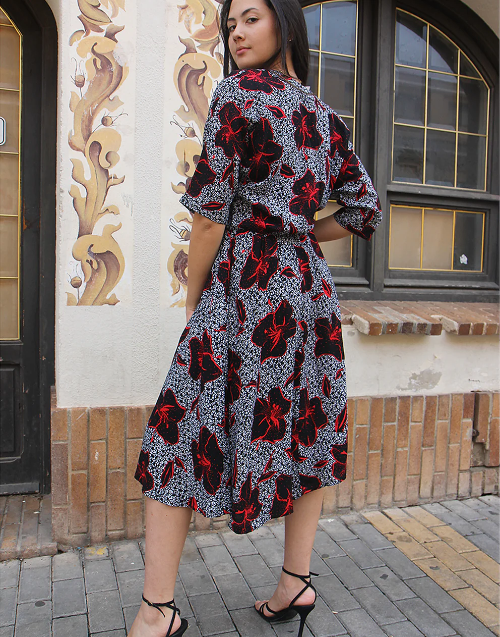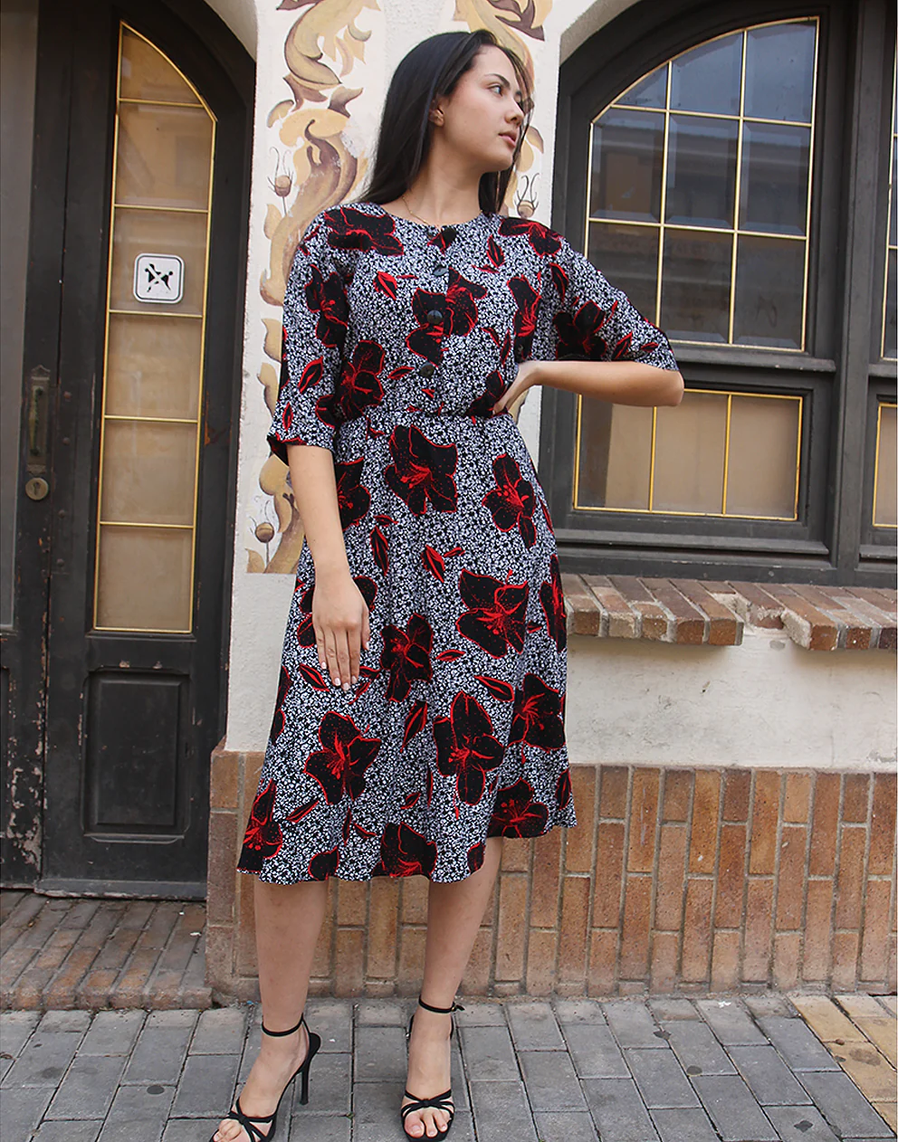 Measurements: 46″/ 117cm bust – 26-32″ / 66-81cm waist – 50″ / 127cm hips – 16″ / 41cm sleeve length – 47″ / 120cm dress length.