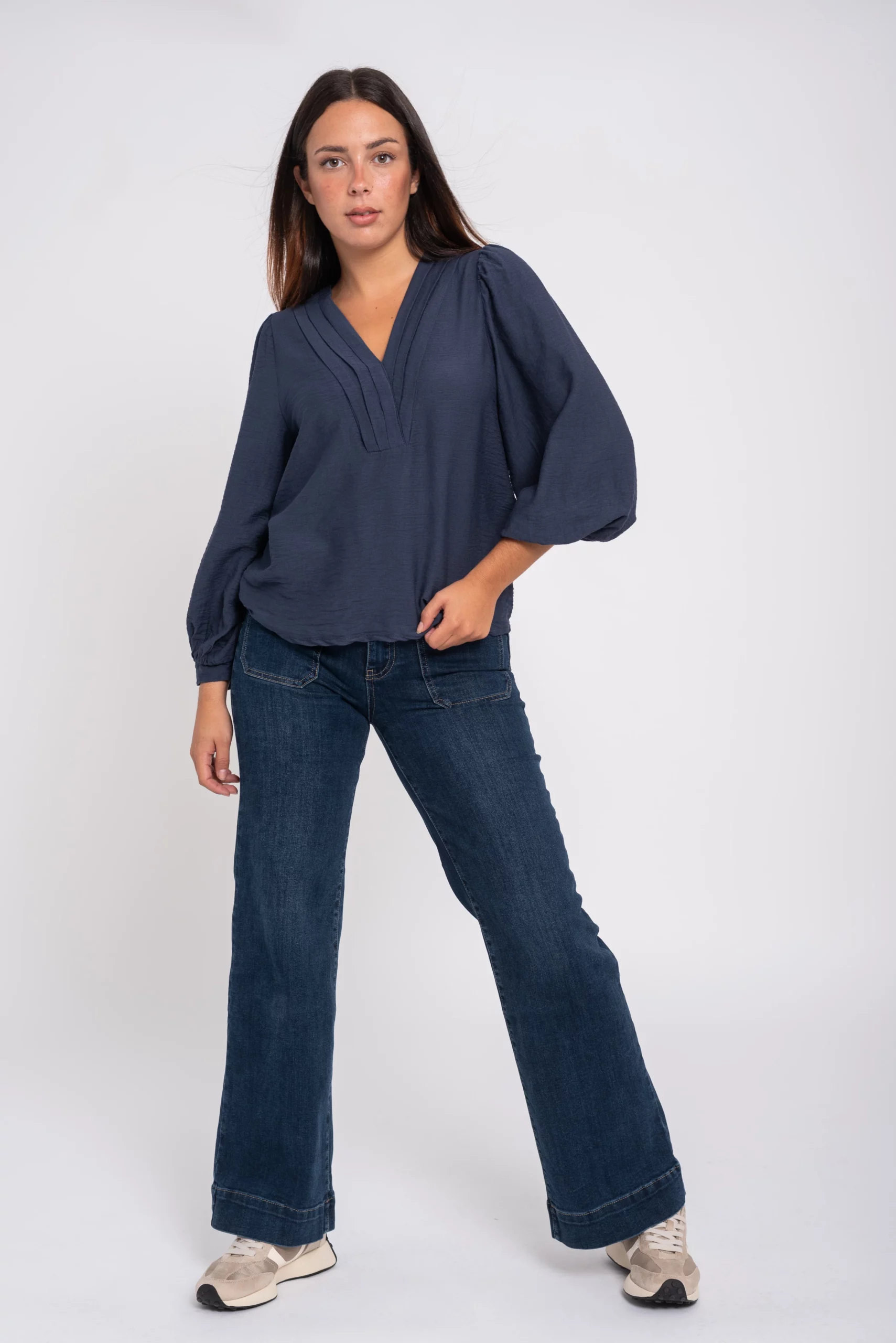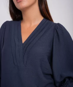 Blusa de tejido fluido. Escote en pico con detalle de jaretas en ambos lados. Manga abullonada con goma en puño. Corte amplio. Un básico ideal para combinar en tus looks de temporada.