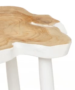 Teak wood natural table top, with it’s soft curves and contrasting white legs and edge finish.