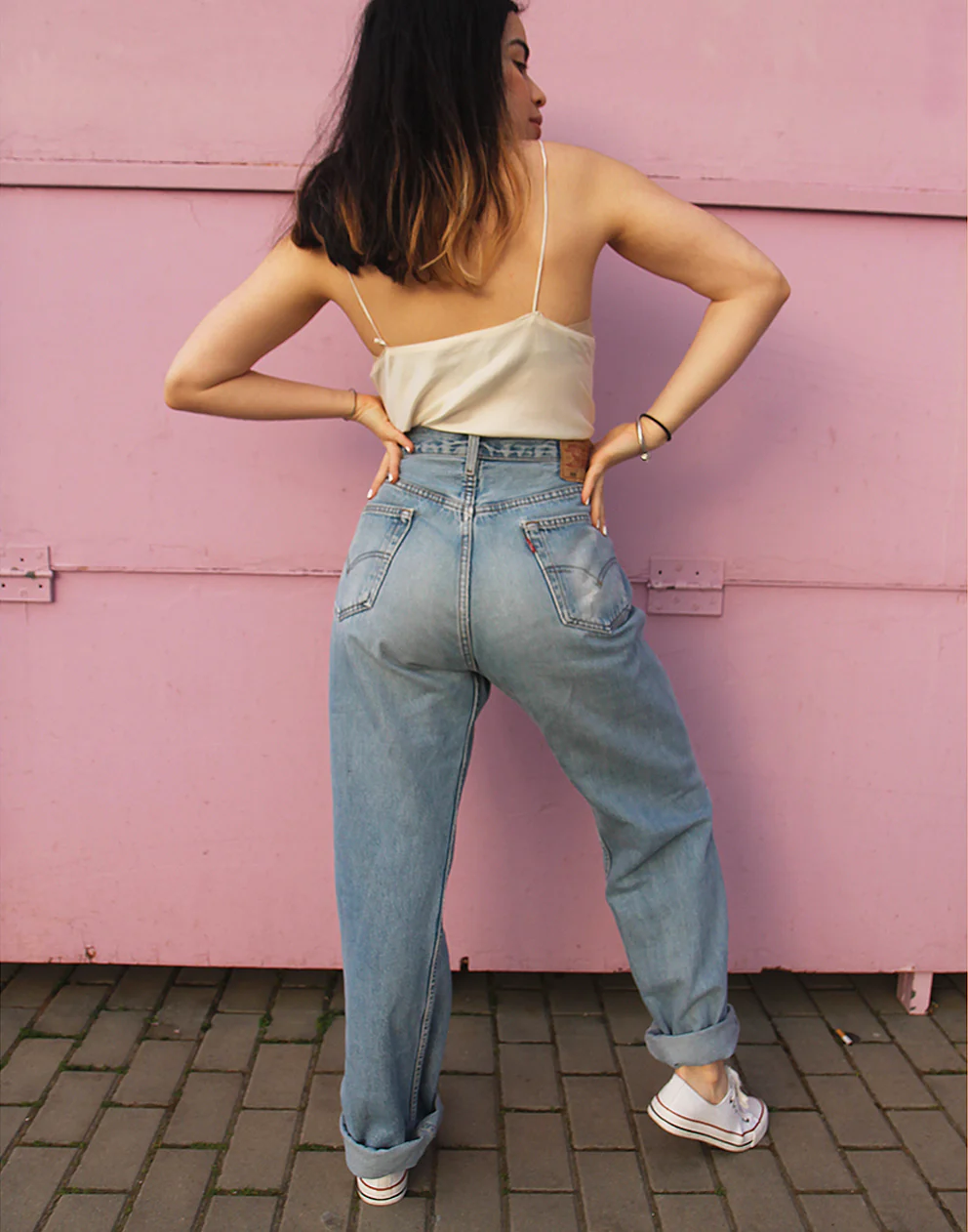 Part of our staple denim collection, original vintage Levi’s 501 Mom jeans in a pale wash blue denim.