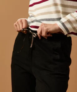 Pantalón largo en color negro. Tiro medio, cintura elástica ajustable con cordón de rayas y diseño recto.