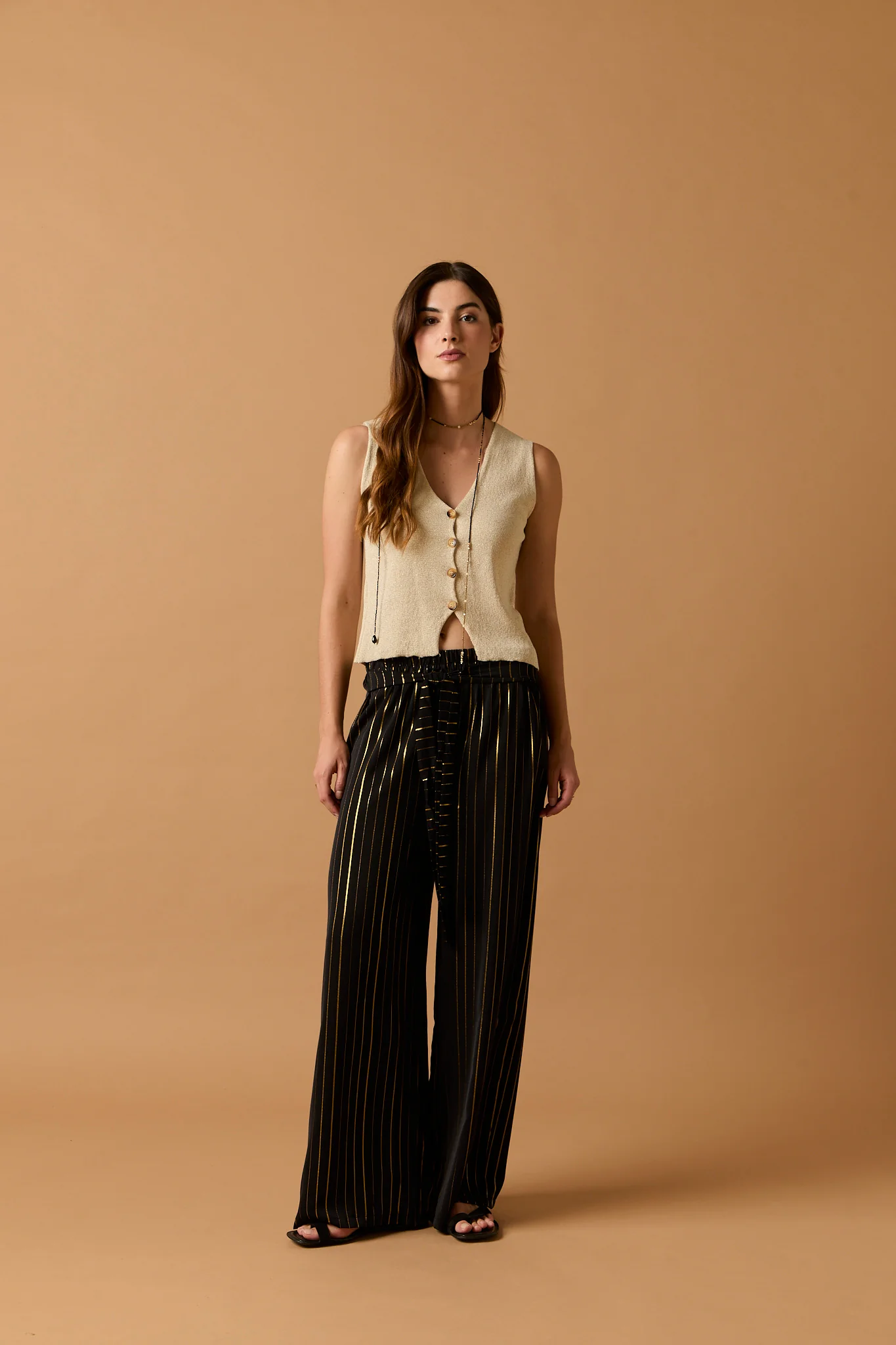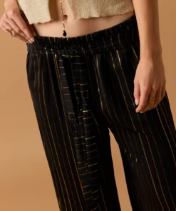 Pantalón largo de fluido en color negro con detalle de rayas en hilo metalizado dorado. Diseño recto, tiro alto, cintura elástica y cierre de lazo.