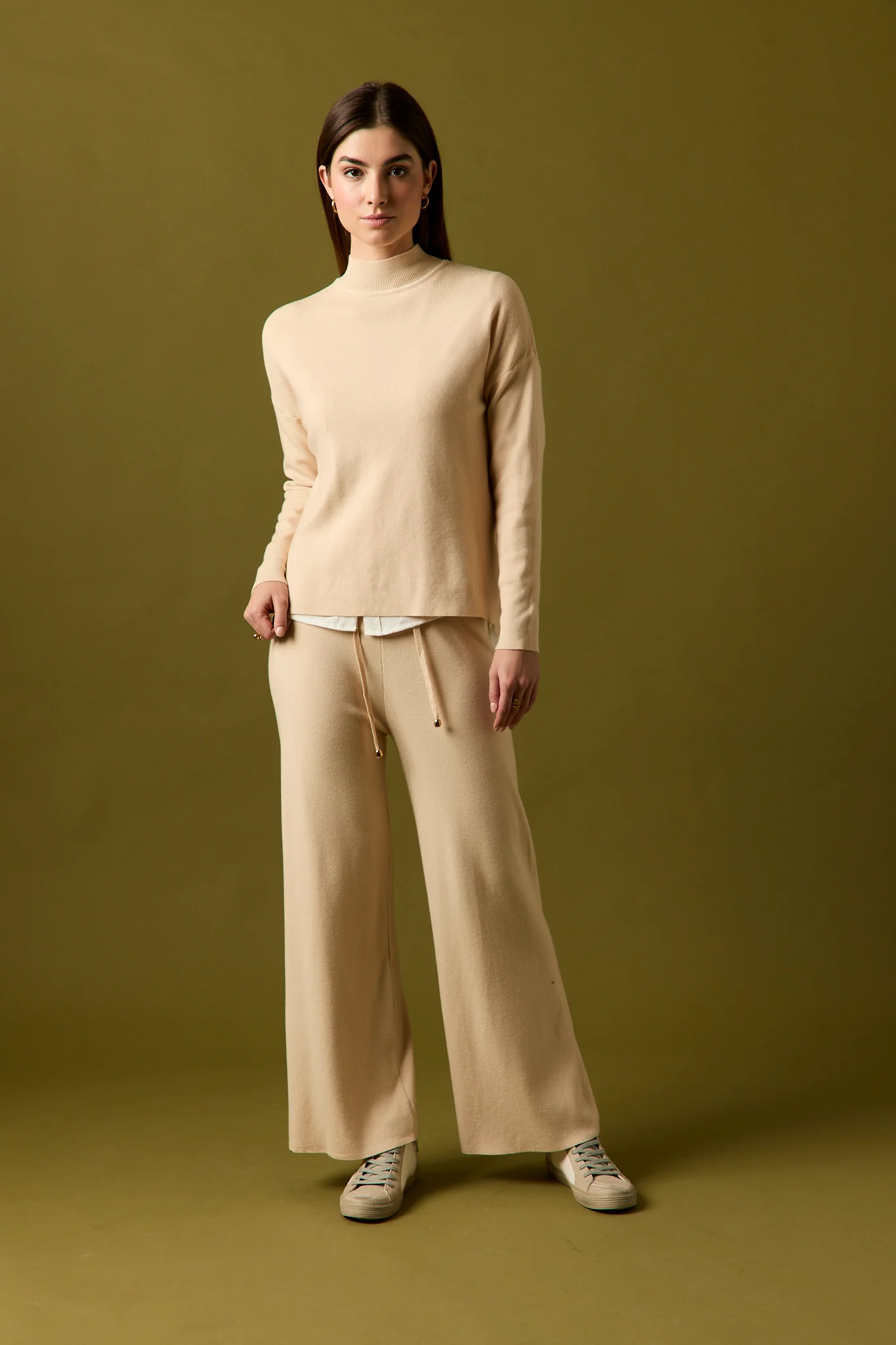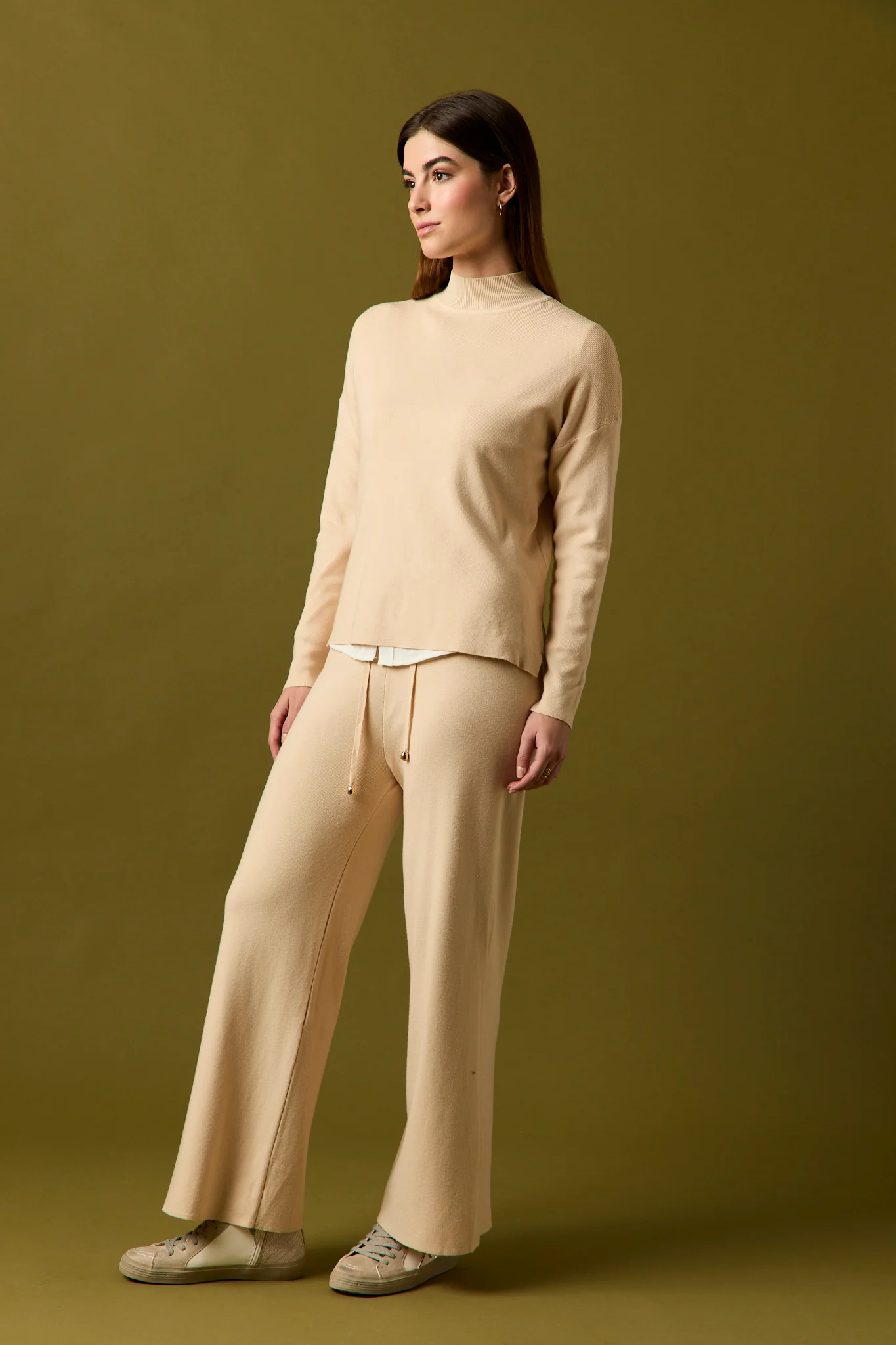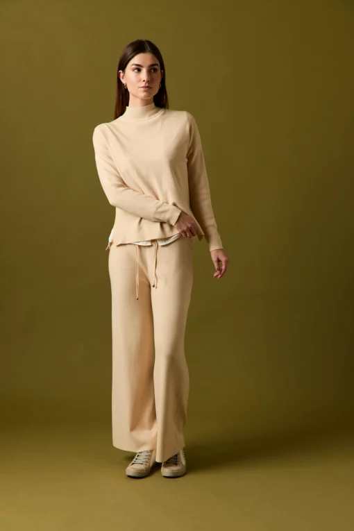 Pantalón de punto en color beige. Tiro alto, cintura elástica, diseño recto y detalle de cordones.