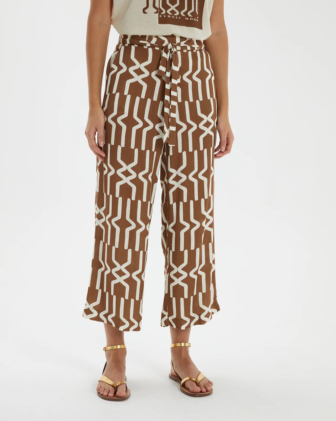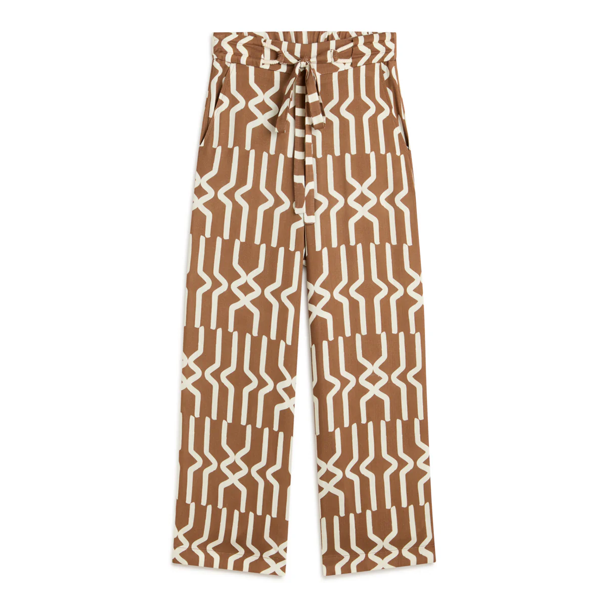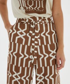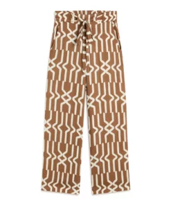 Pantalón ancho, tobillero con bolsillos en los lados, cinturón de la misma tela y cinturilla elástica