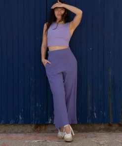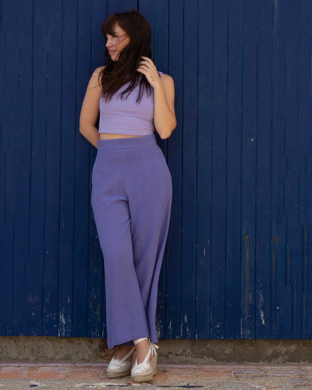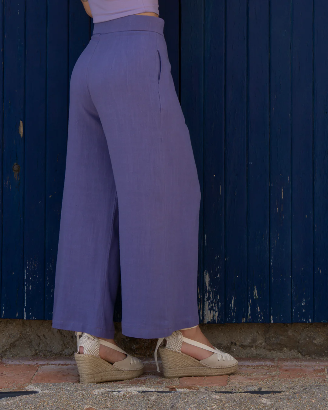 Pantalón midi, de pata ancha. Tiro muy alto. Bolsillos laterales. Cinturilla de 5cm.