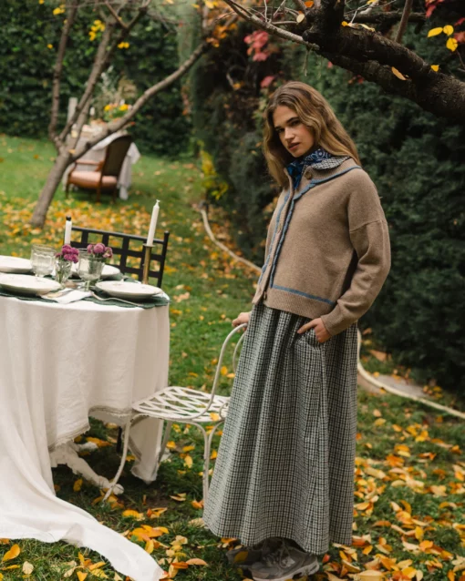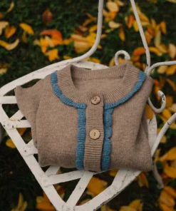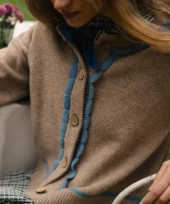 Rebeca cuadrada en color camel con ondas azules. Gustosa y especial, es un fondo de armario súper especial y un regalo perfecto.