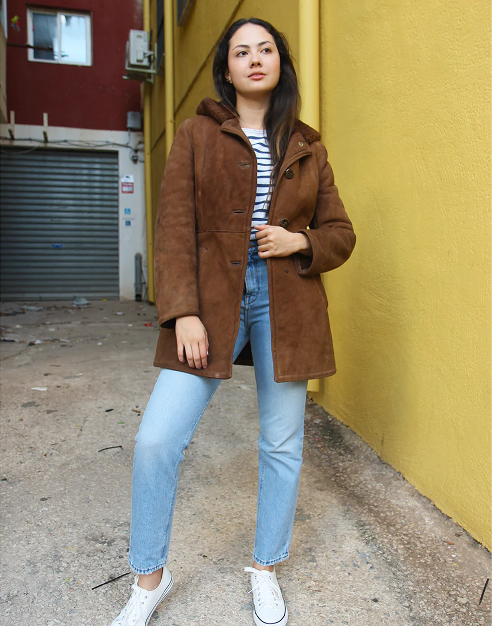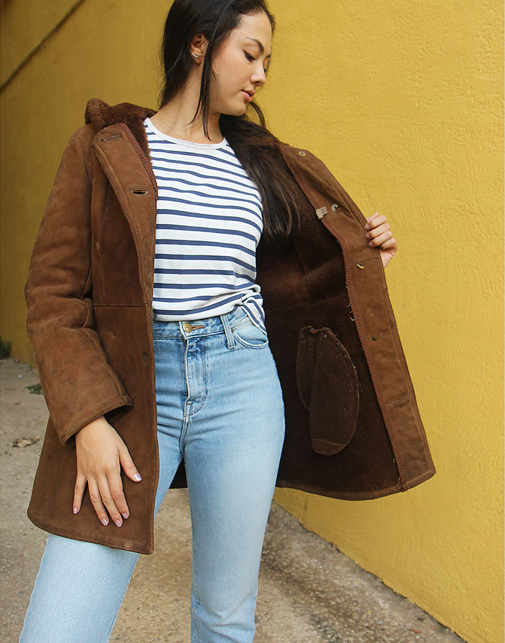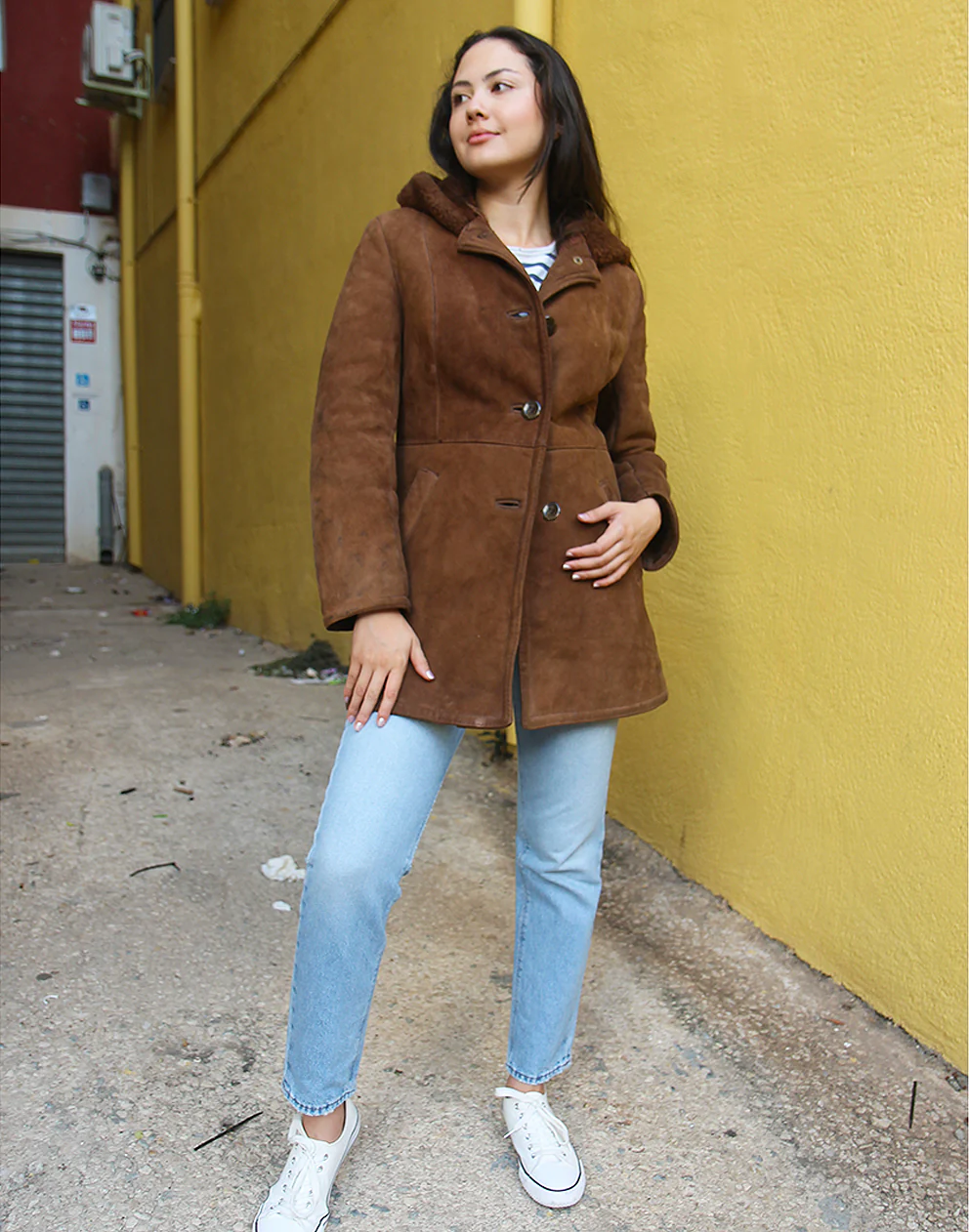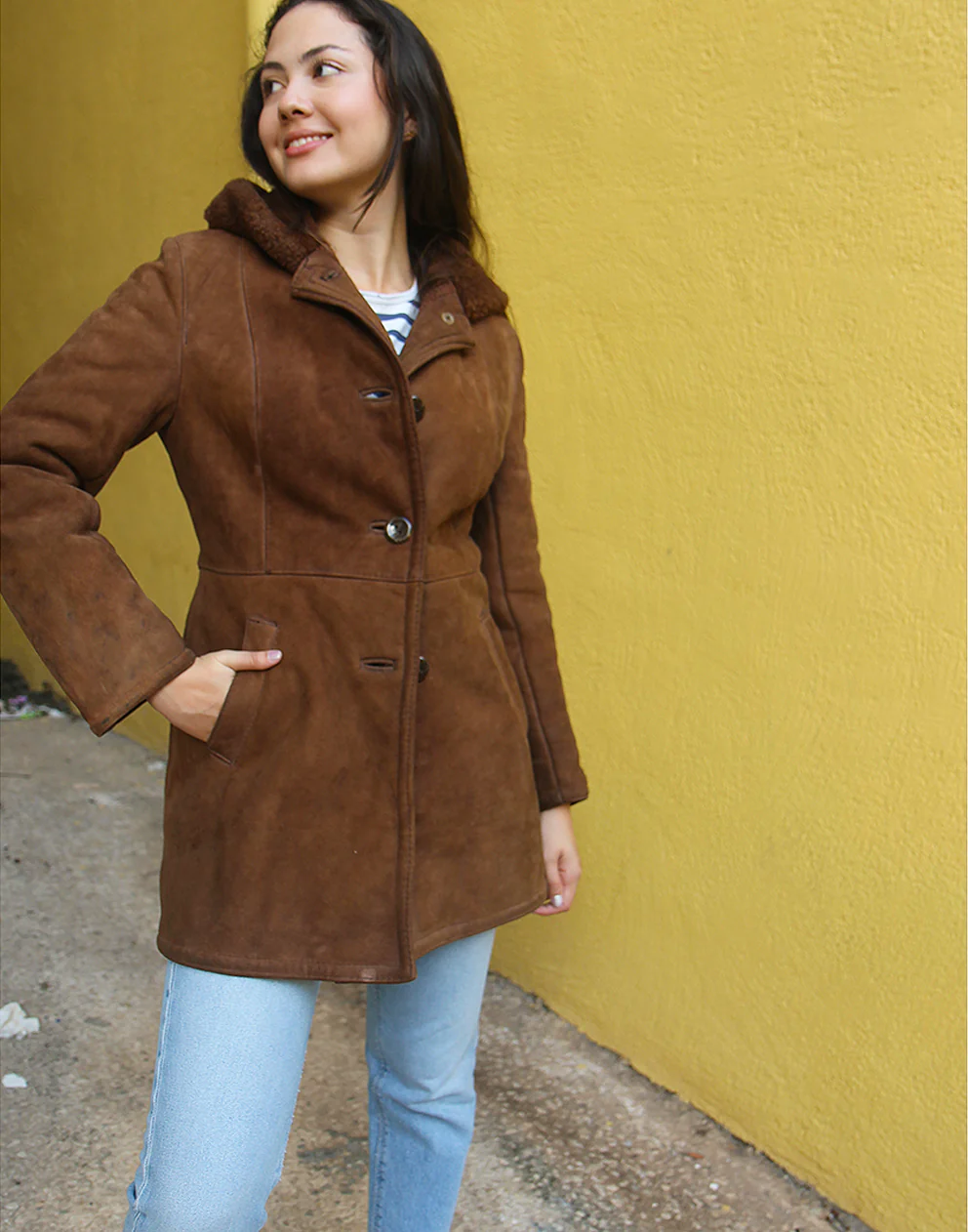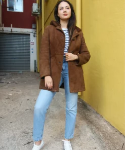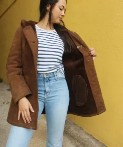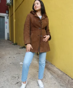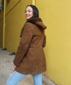 Hooded shearling coat in brown real suede.