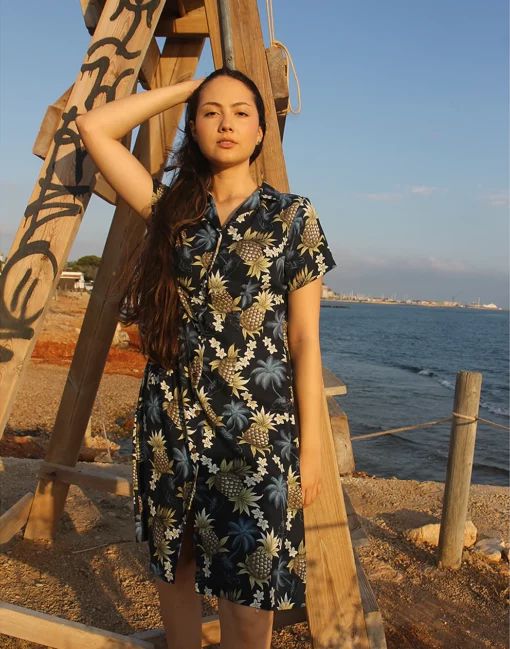 Measurements: 38″/ 97cm bust – 32″ / 81cm waist – 42″ / 107cm hips – 7″ / 18cm sleeve length – 40″ / 102cm dress length.