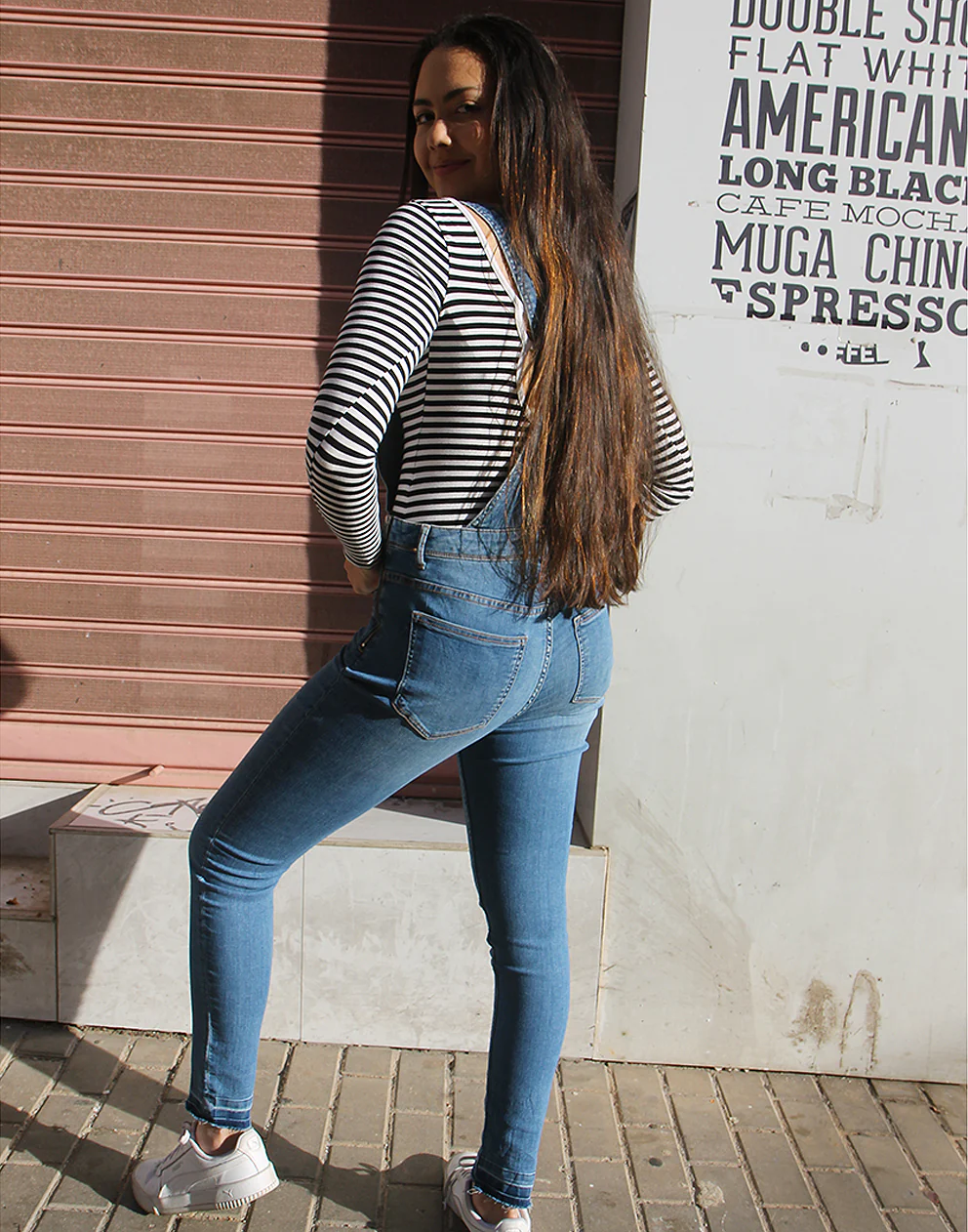 Measurements – 9.5″(25cm) top of bib – 13″(33cm) bottom of bib – 32″(82cm) waist – 36″(92cm) hips – 30″(76cm) inner leg – 11″(28cm) rise.