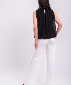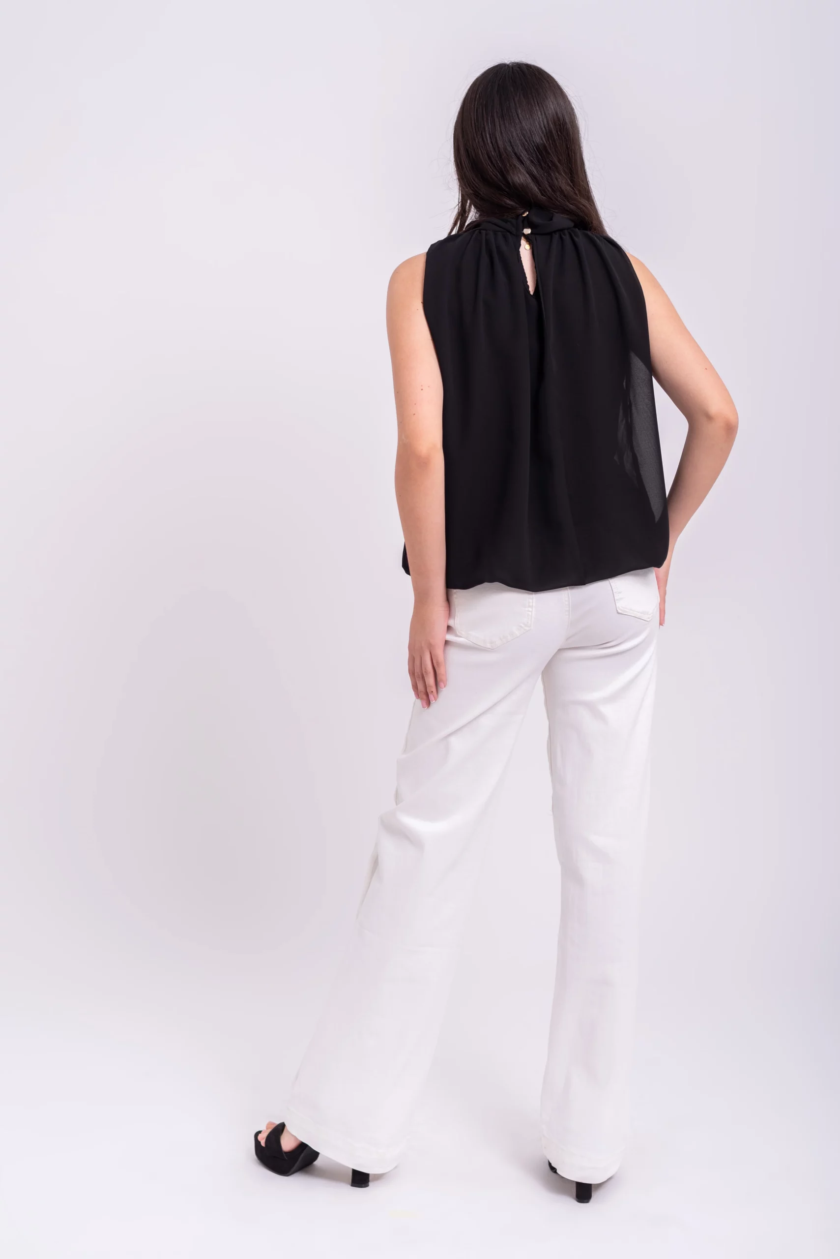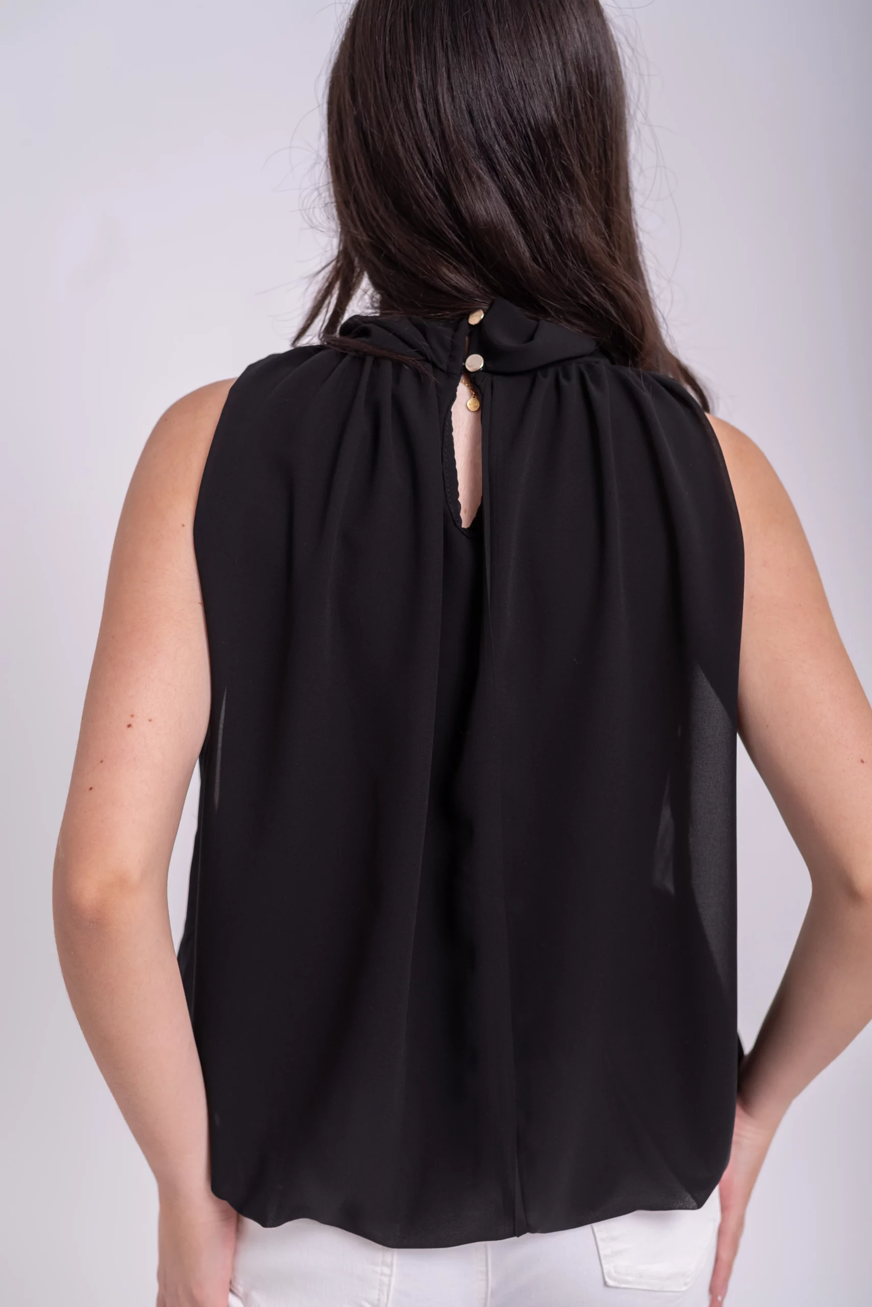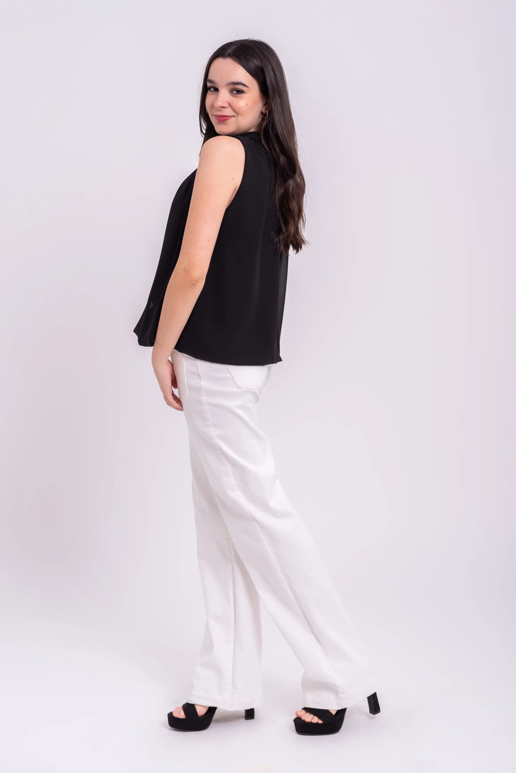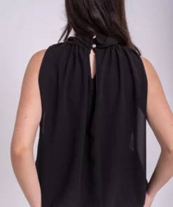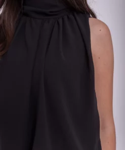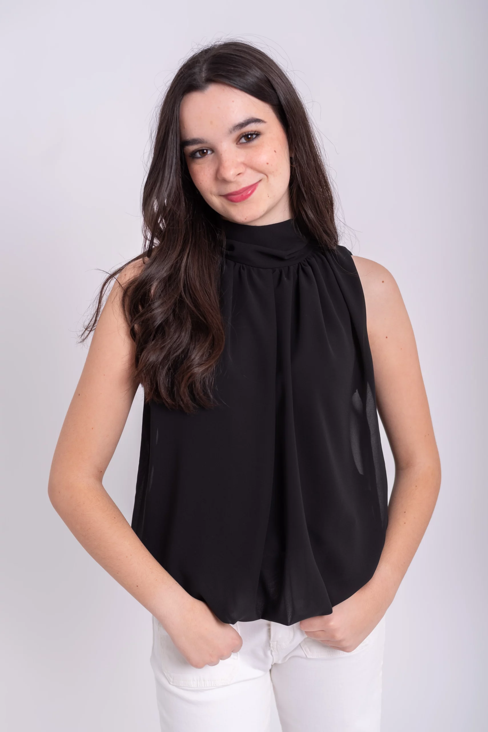 Blusa sin mangas. Cuello halter. Gasa ligera con forro. Corte abullonado. Largo a cadera. Elastico. Super adaptable y favorecedora.