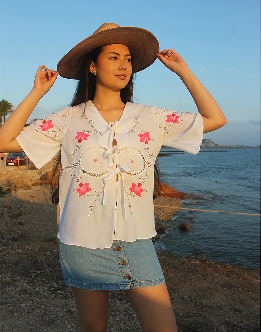 Tie front blouse in white with hand embroidered floral details and crochet panels.