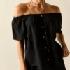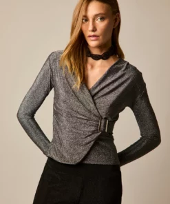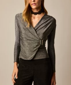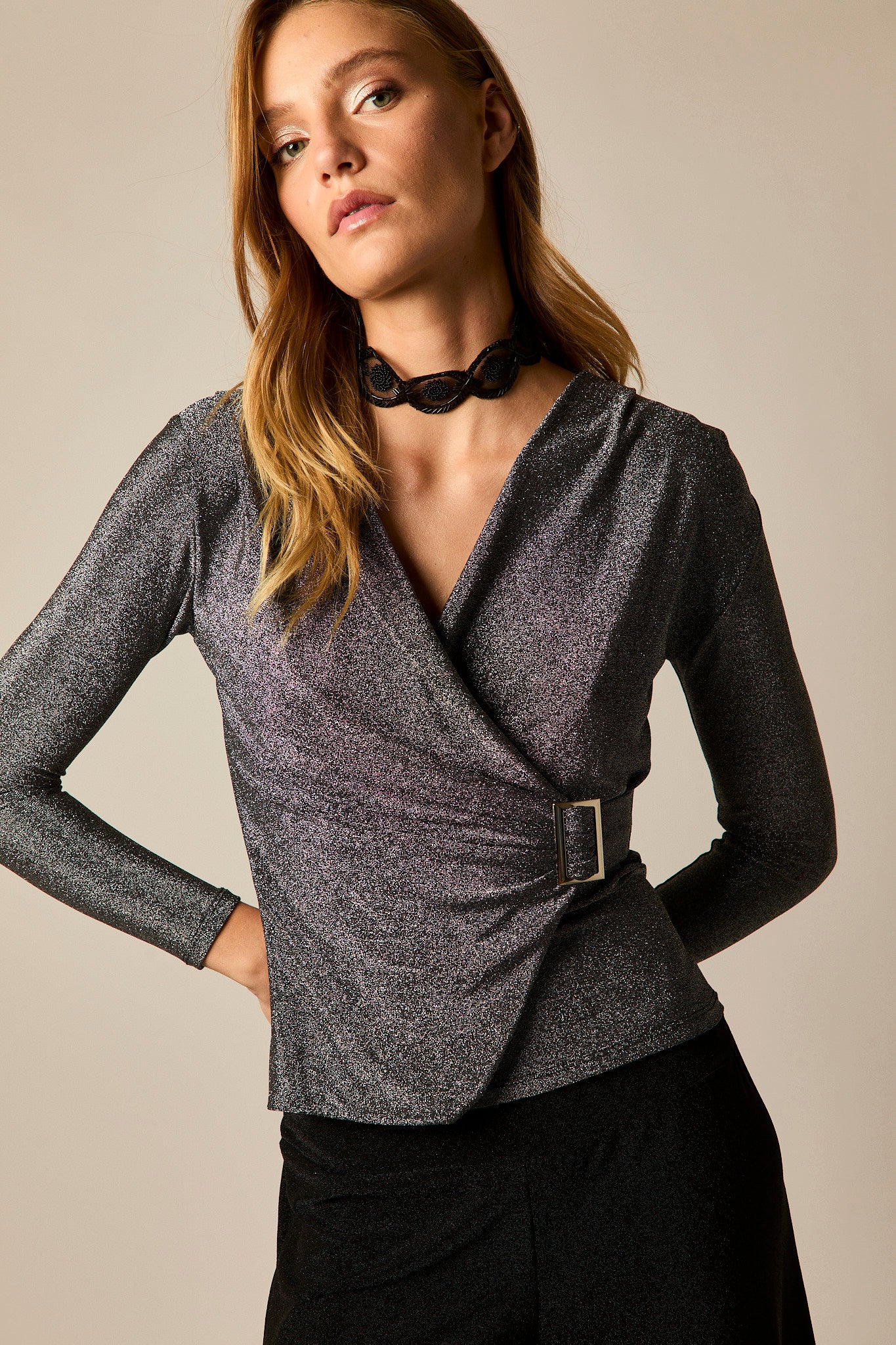 Top cruzado de lurex en color plateado. Cuello pico cruzado, manga larga, detalles drapeados y hebilla metálica en un lateral.