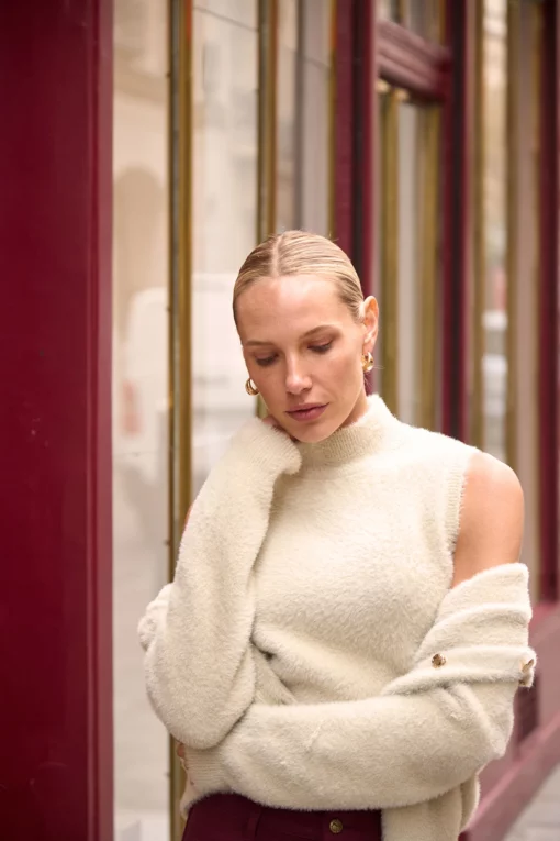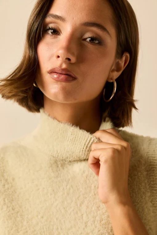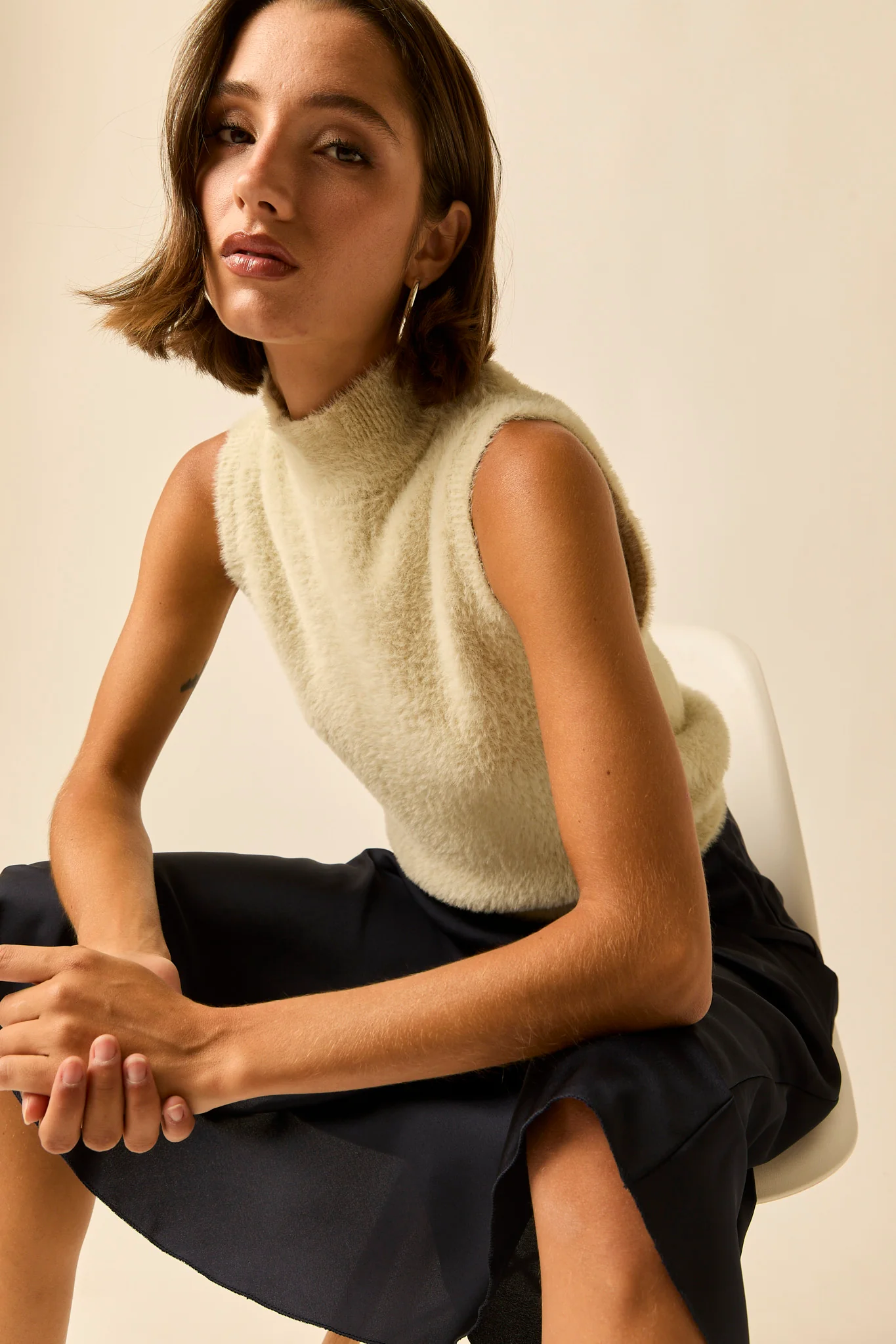 Top de pelito en color beige. Cuello chimenea, sin mangas y diseño recto. Esta prenda tiene un tacto muy gustoso y la puedes llevar con su chaquetita a juego.