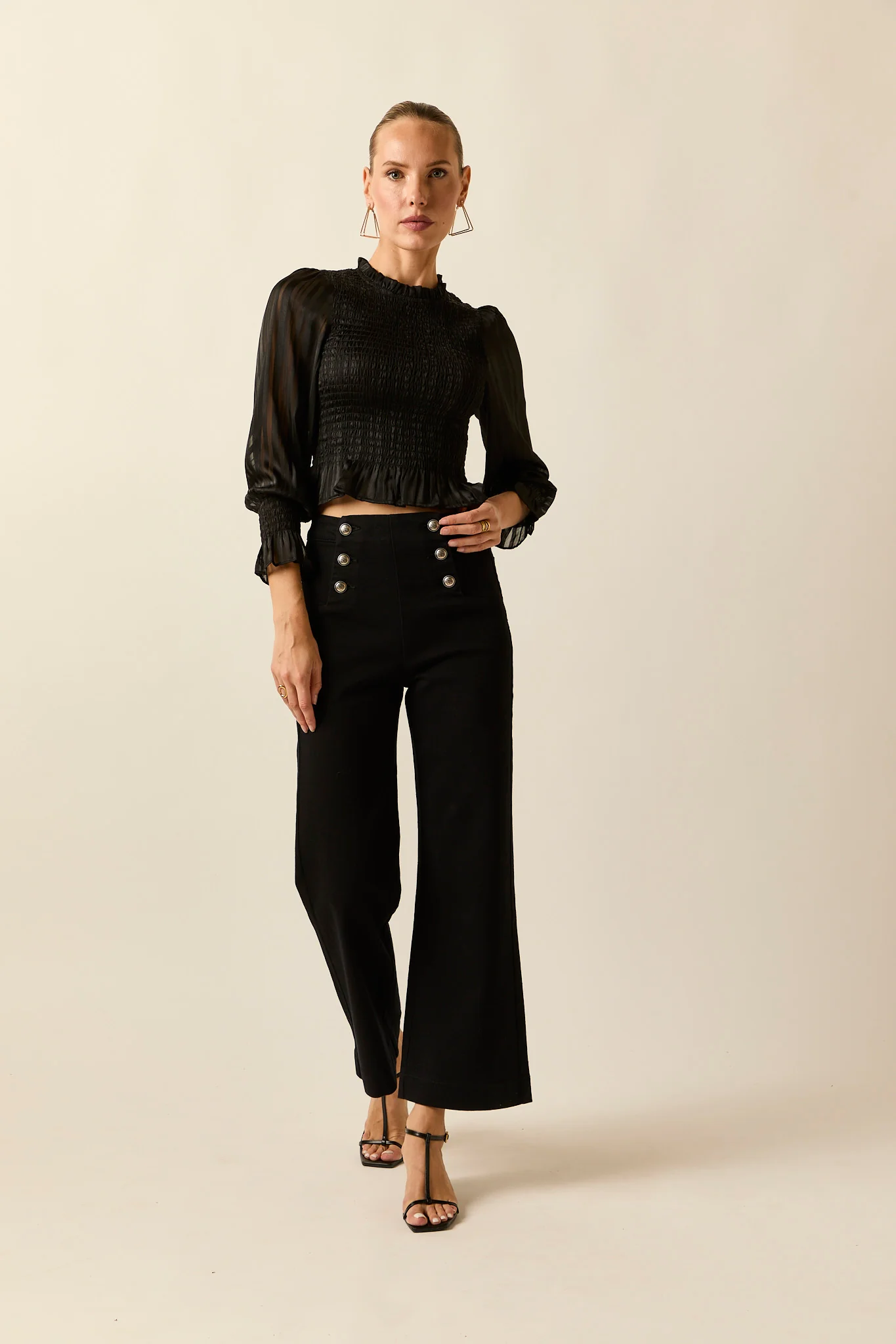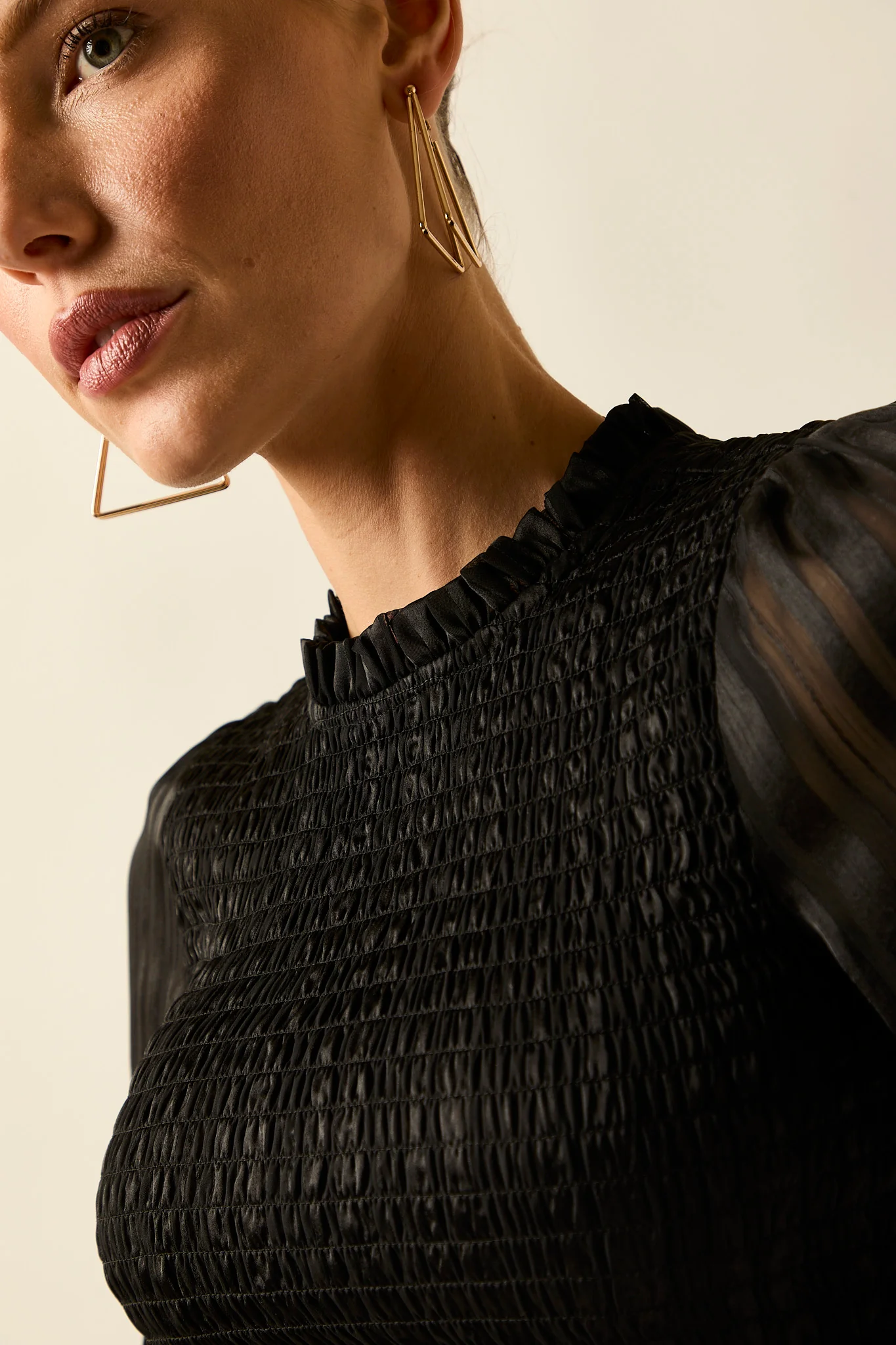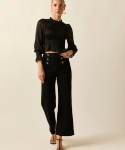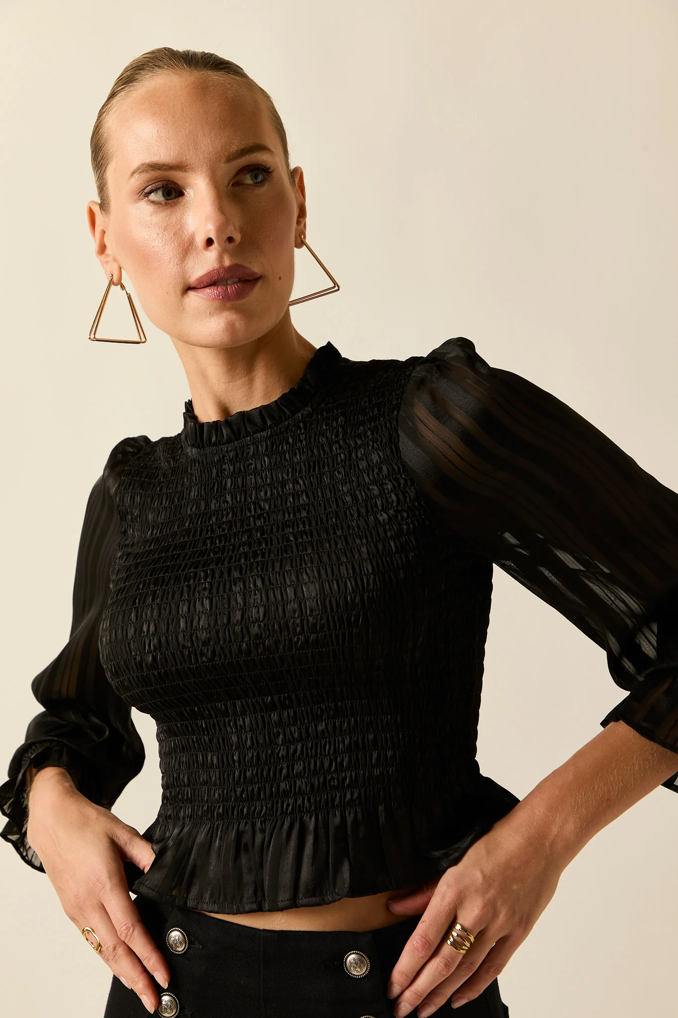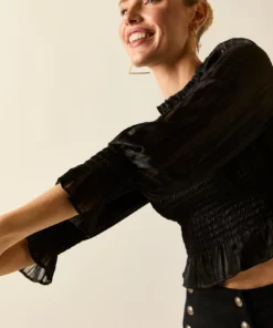 Top fruncido en color negro. Cuello caja, cuerpo de nido de abeja, manga 3/4 abullonada semitransparente y cierre de botón en la espalda.