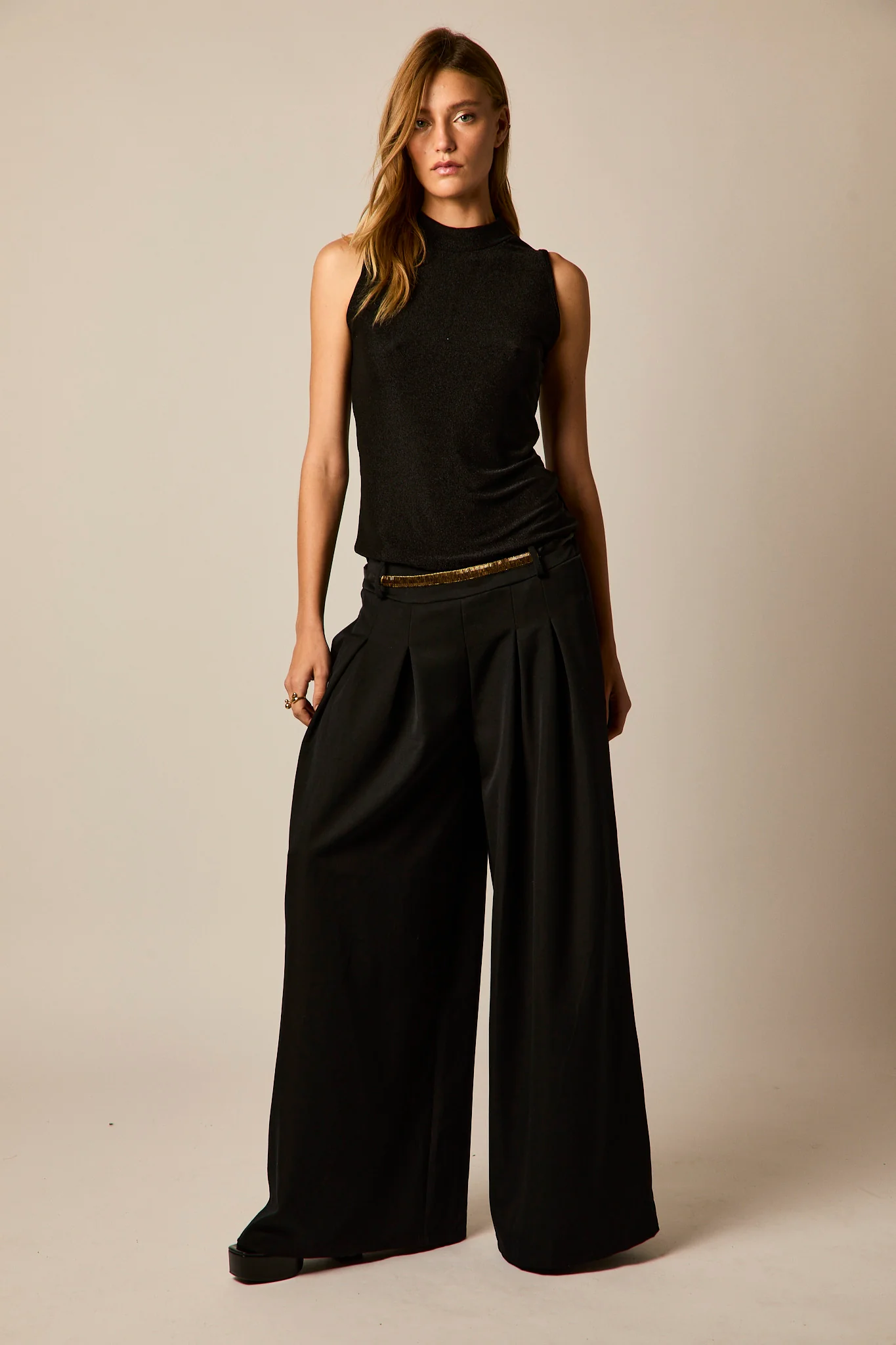 Top de lurex en color negro. Cuello alto, sin mangas y diseño recto.