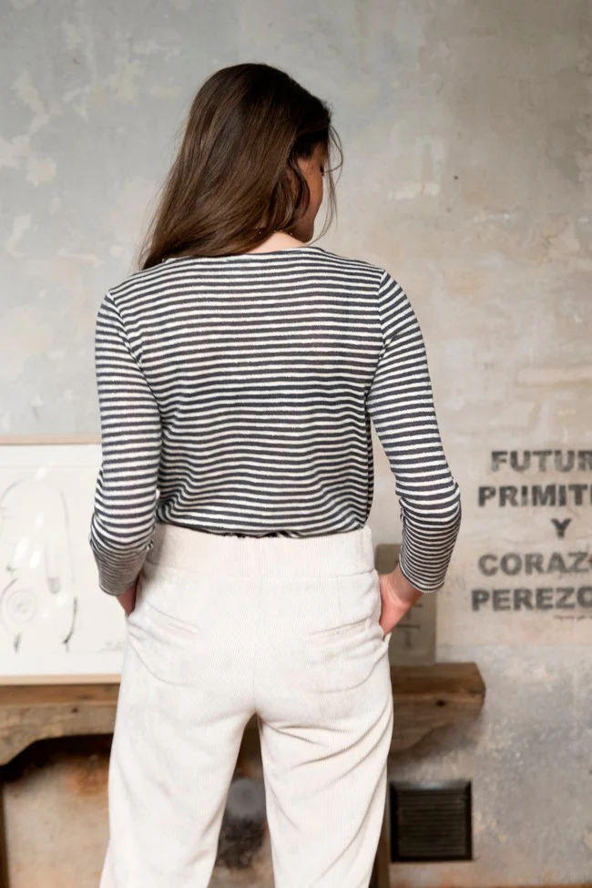 Top de rayas grises con un toque lurex plateado, realizado en un tejido mezcla de algodón suave y ligero.