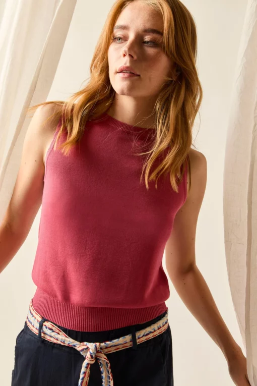 Top básico de punto en color fresa. Cuello caja, sin mangas y diseño recto. Puedes combinarla con su cárdigan a juego y ¡estarás ideal!