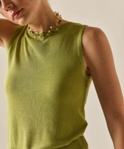 Top básico de punto en color lima. Cuello caja, sin mangas y diseño recto. Puedes combinarla con su cárdigan a juego y ¡estarás ideal!