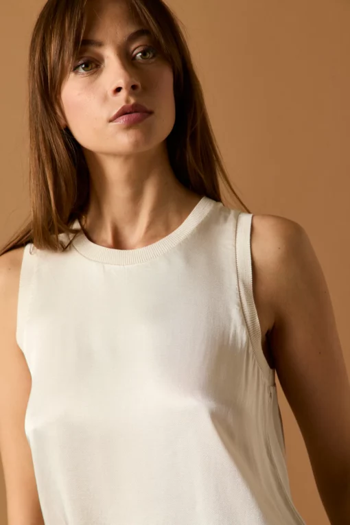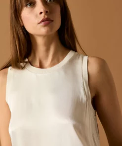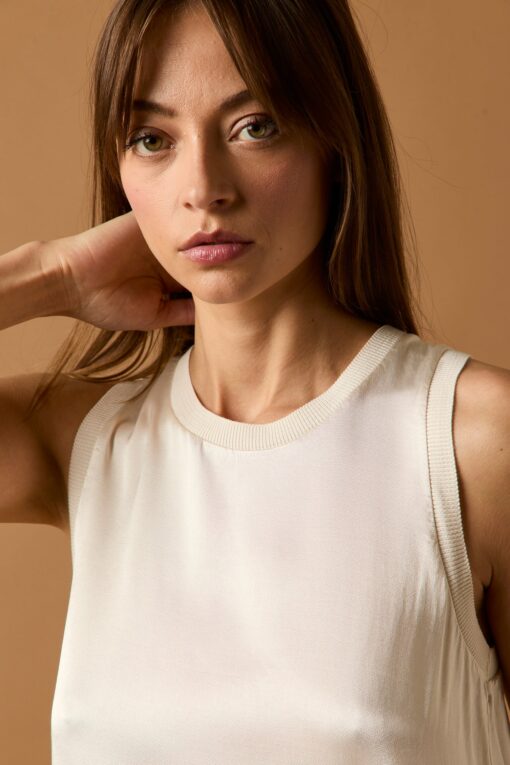 Top de raso en color crema. Cuello caja, sin mangas y diseño recto y amplio.
