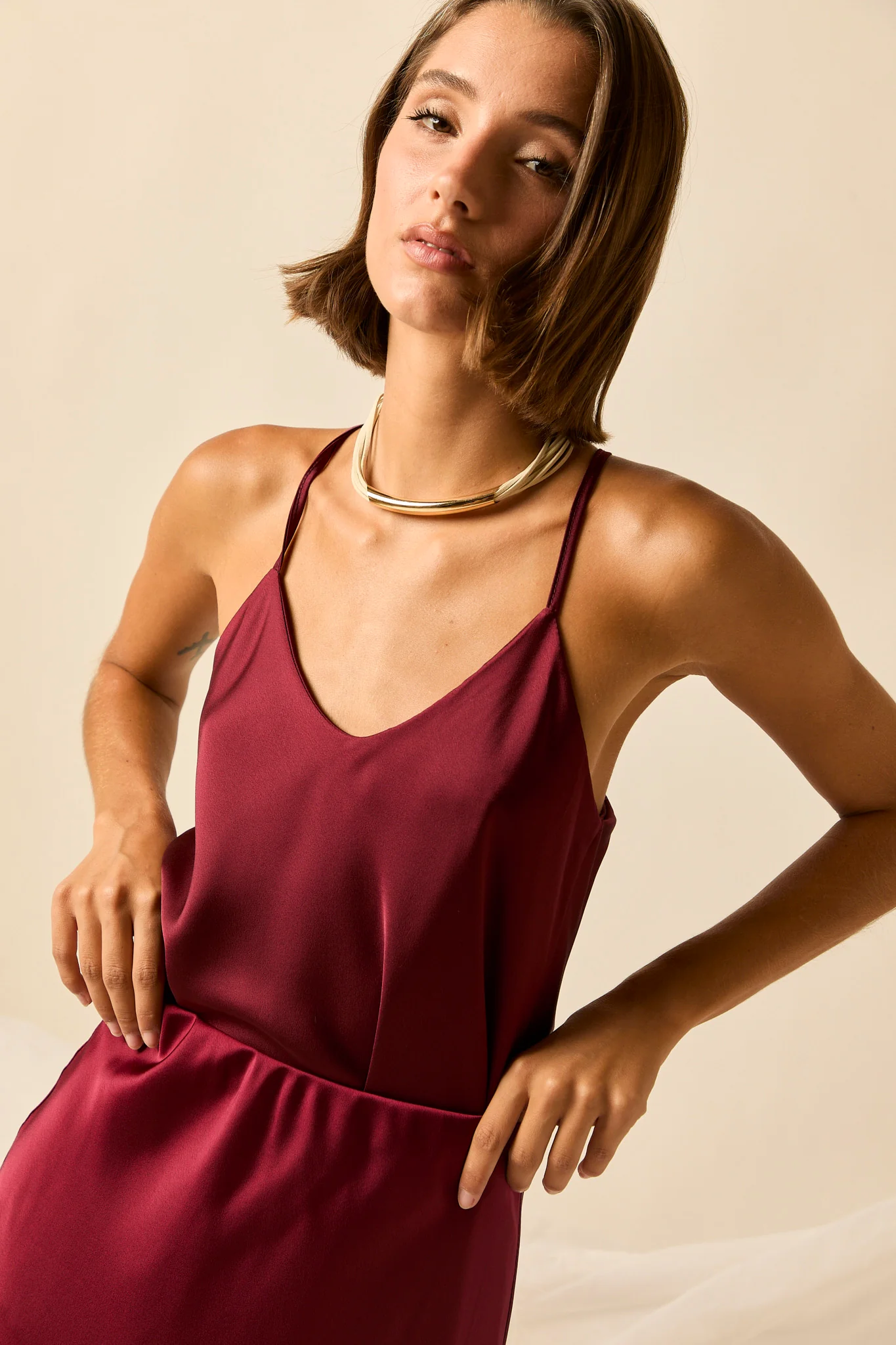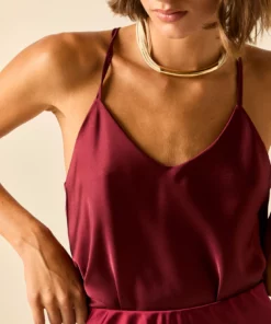 Top de raso en color vino. Cuello pico, tirante fino y diseño recto y fluido.