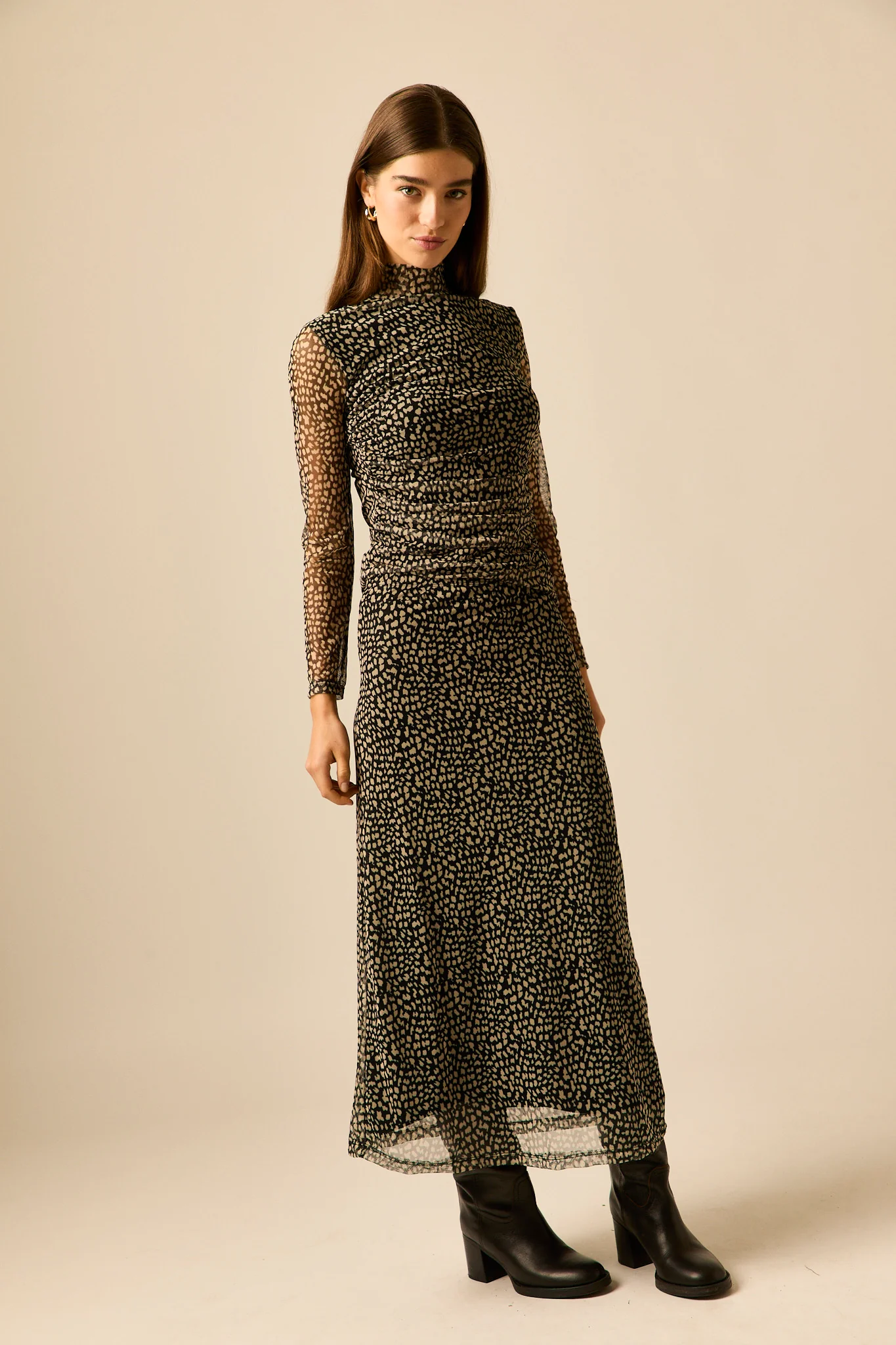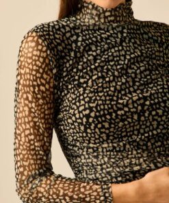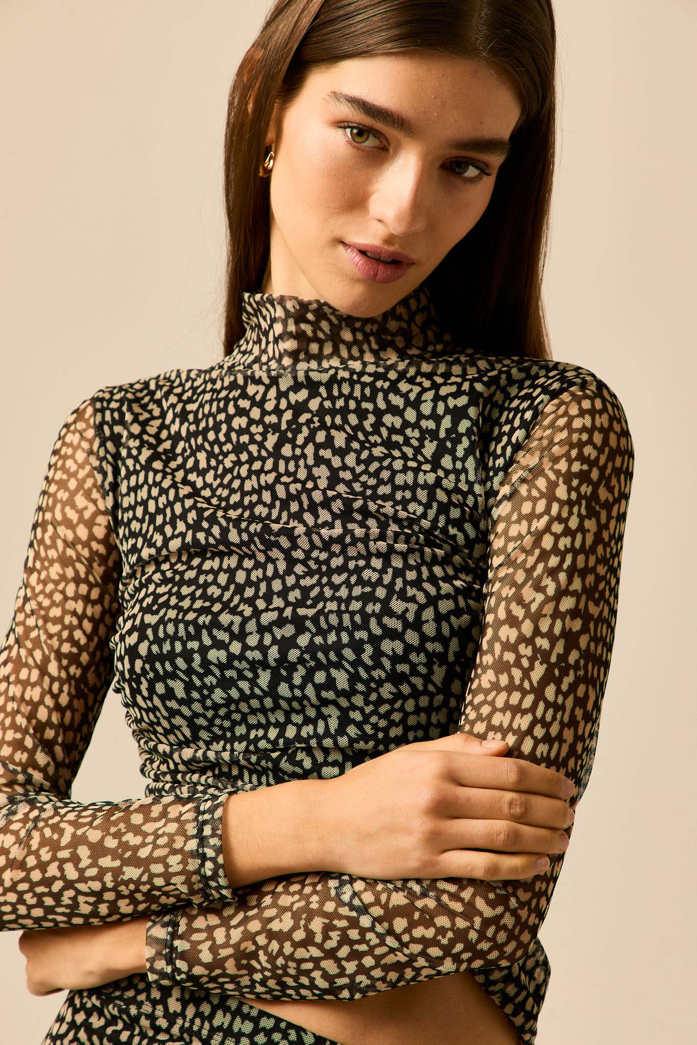 Top de tul bicolor en tonos negro y beige de estampado animal print. Cuello chimenea, manga larga semitransparente y diseño entallado.
