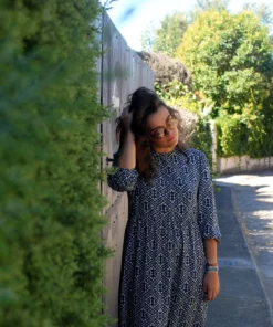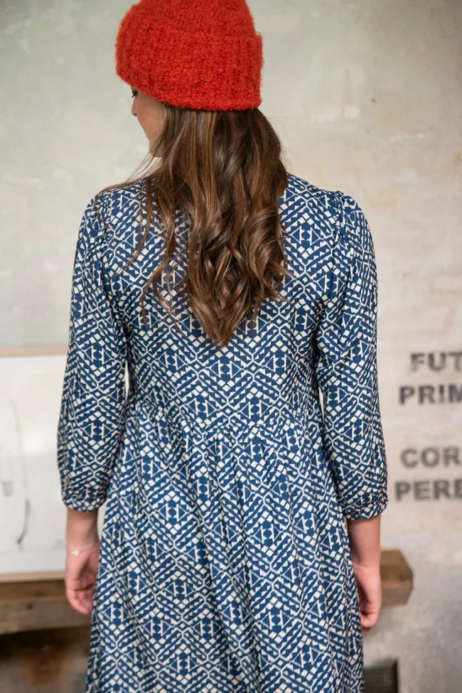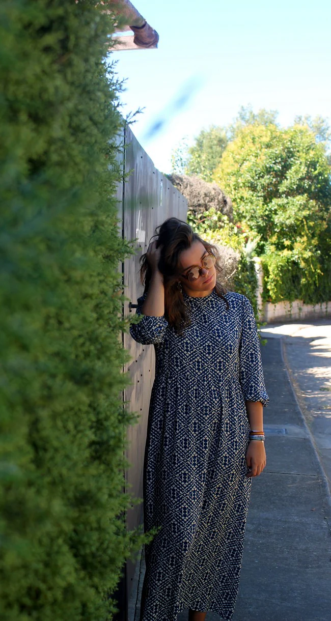 Vestido largo en estampado azul y beige, realizado en un tejido de viscosa.