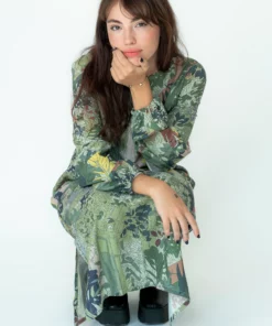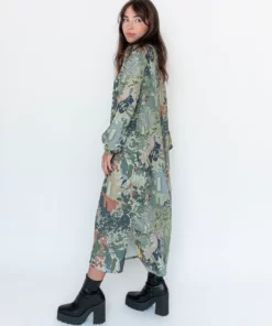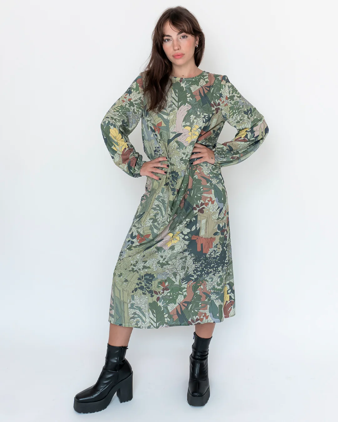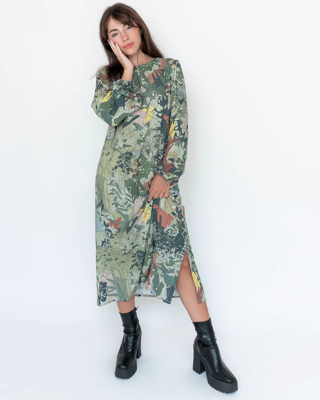 Vestido midi de manga larga y cuello a la caja con botón en la espalda. Aperturas laterales y puños ajustados con elástico.