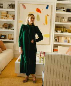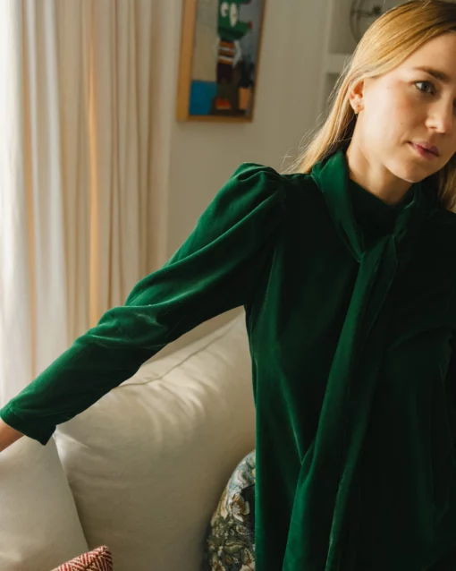 Me arrasa el tono verde guisante tan especial del terciopelo, y me gusta muchísimo lo bien que sienta. El lazo del cuello, la manga un poco afarolada y que sea un vestido largo y ligeramente evasé, hacen que sea una opción comodísima y súper estilosa.