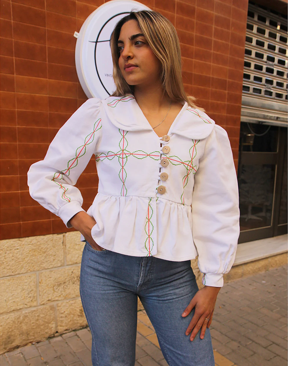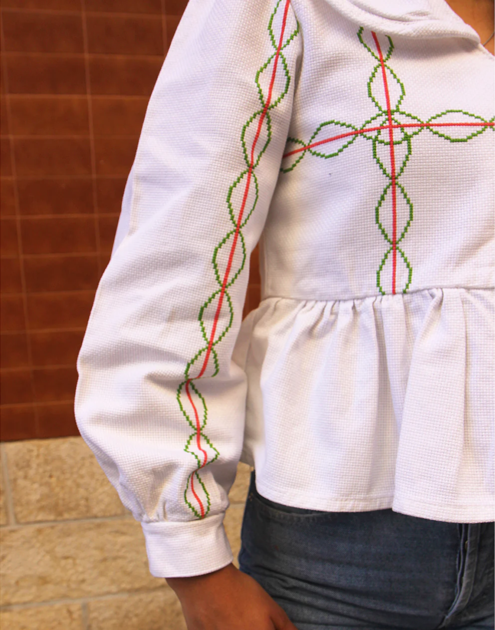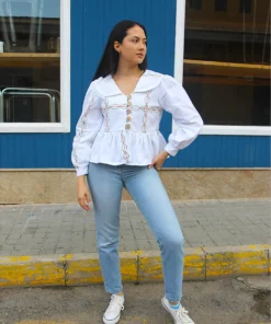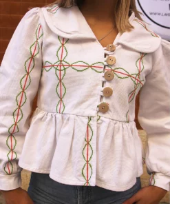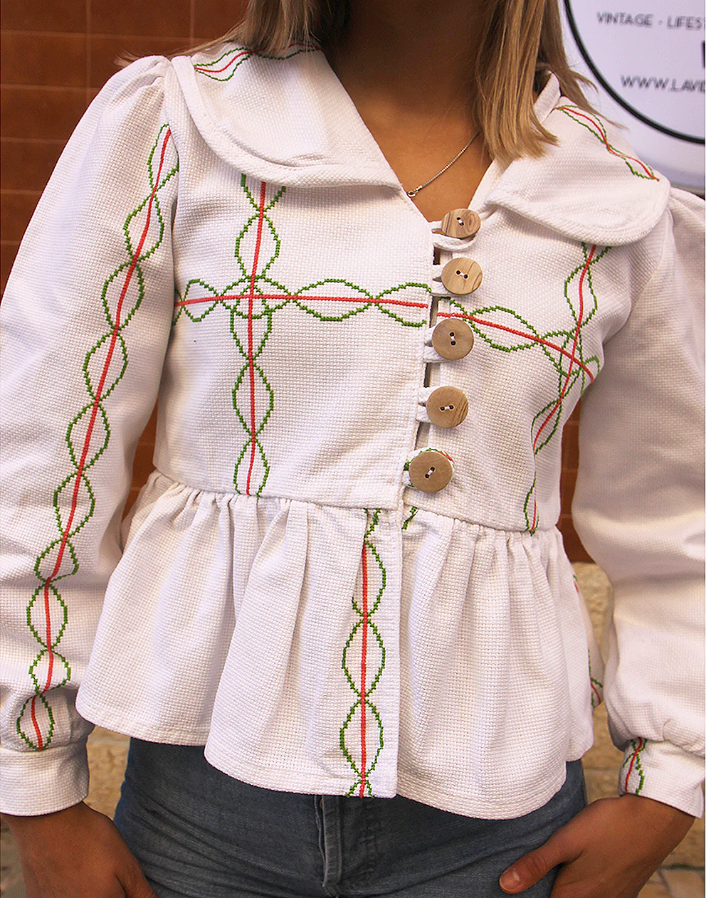 Measurements: 40″/ 102cm bust – 23″ / 58cm sleeve length – 23″ / 58cm blouse length.