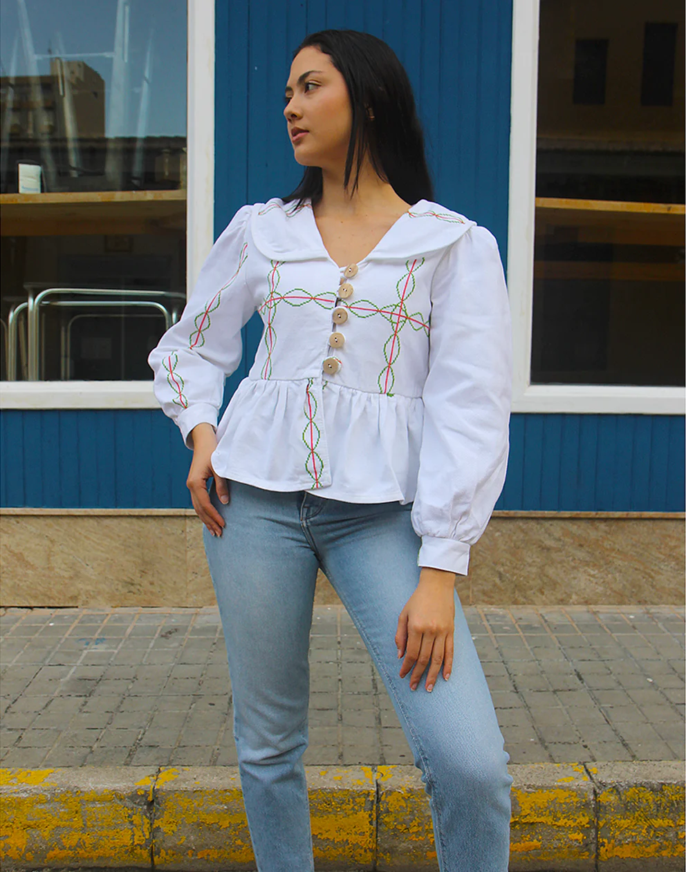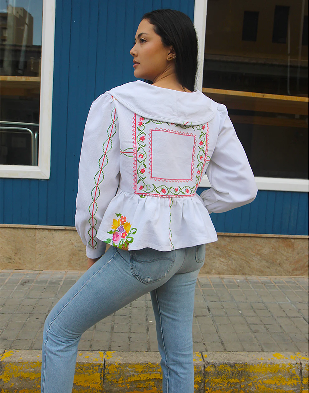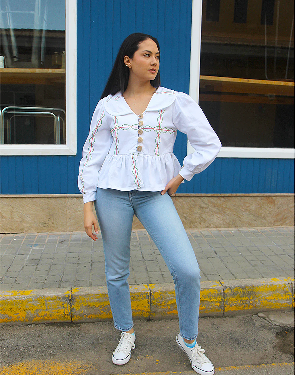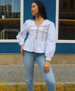 Measurements: 40″/ 102cm bust – 23″ / 58cm sleeve length – 23″ / 58cm blouse length.