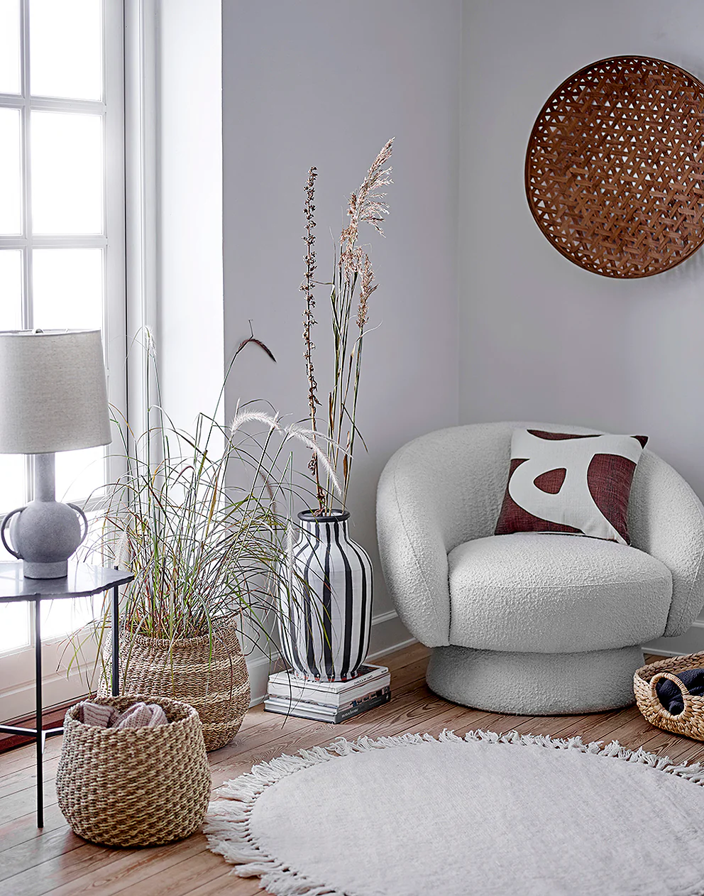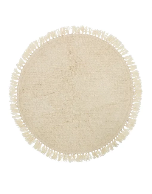 Round rug in cream with fringing.