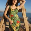Measurements: 38″/ 97cm bust – 30″ / 76cm waist – 46″ / 117cm hips – 9″ / 23cm sleeve length – 50″ / 127cm dress length.