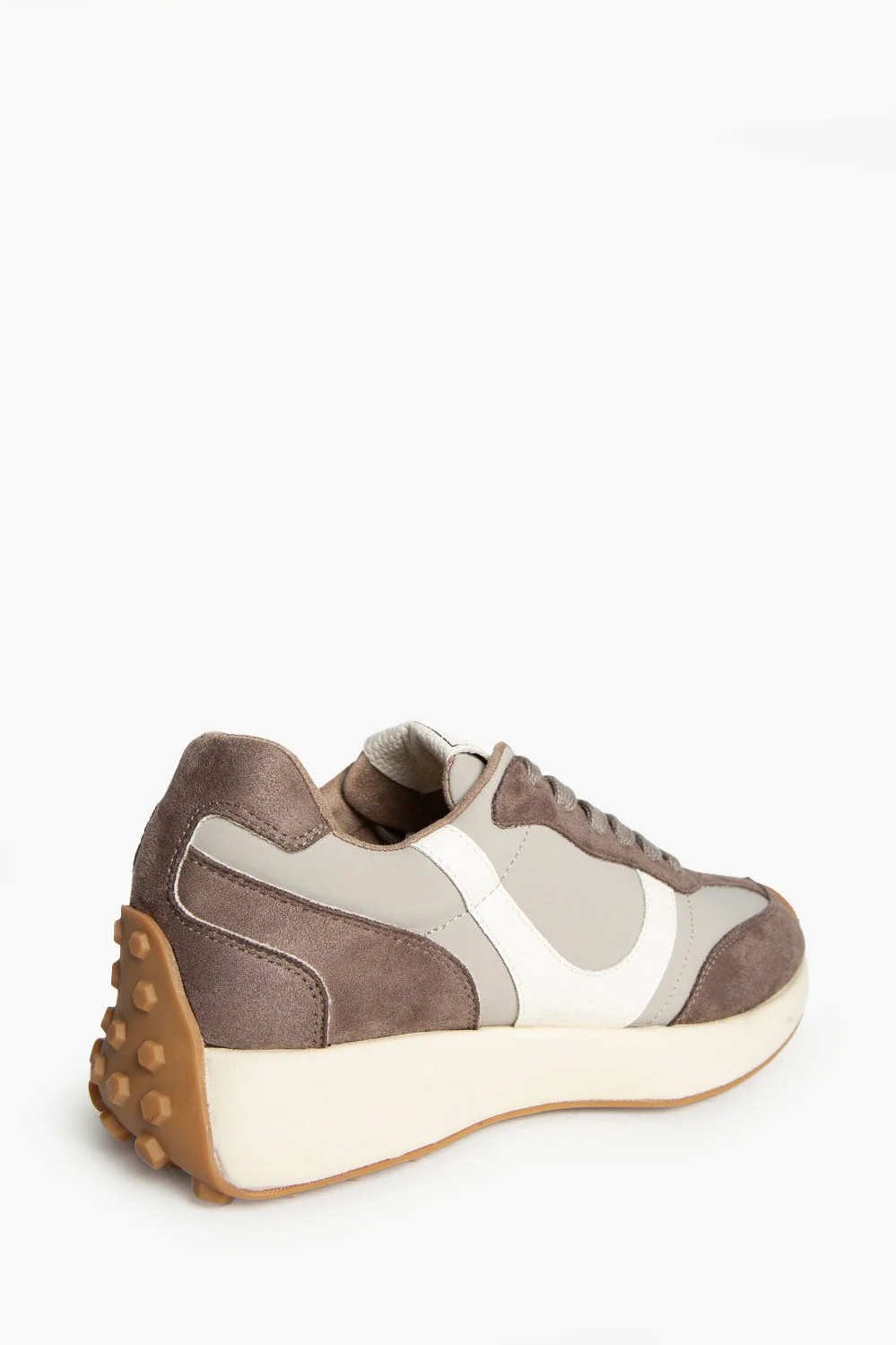 Zapatilla deportiva estilo running. Cierre cordones. Corte en combinación de materiales y colores arena y taupe. Suela dentada en tono miel.